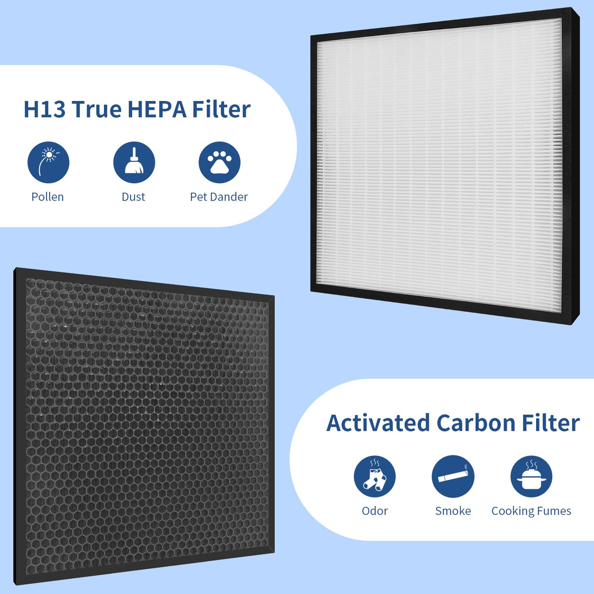 Q: Does the carbon filter help with odors from pets and cooking?A: Yes, the activated carbon filter included in this replacement set effectively eliminates indoor odors from various sources, such as smoke, cooking, and pet odors, ensuring a fresher living environment.