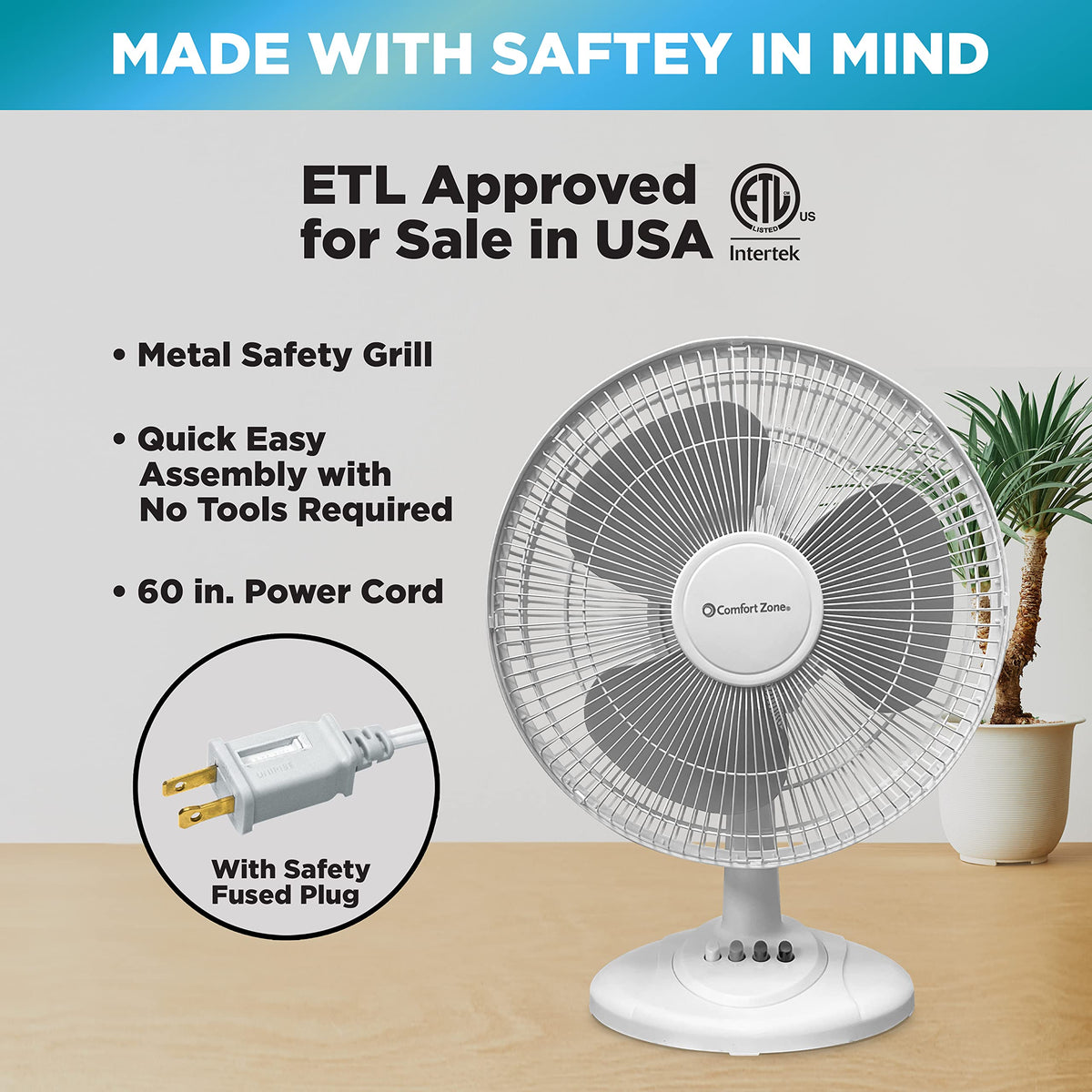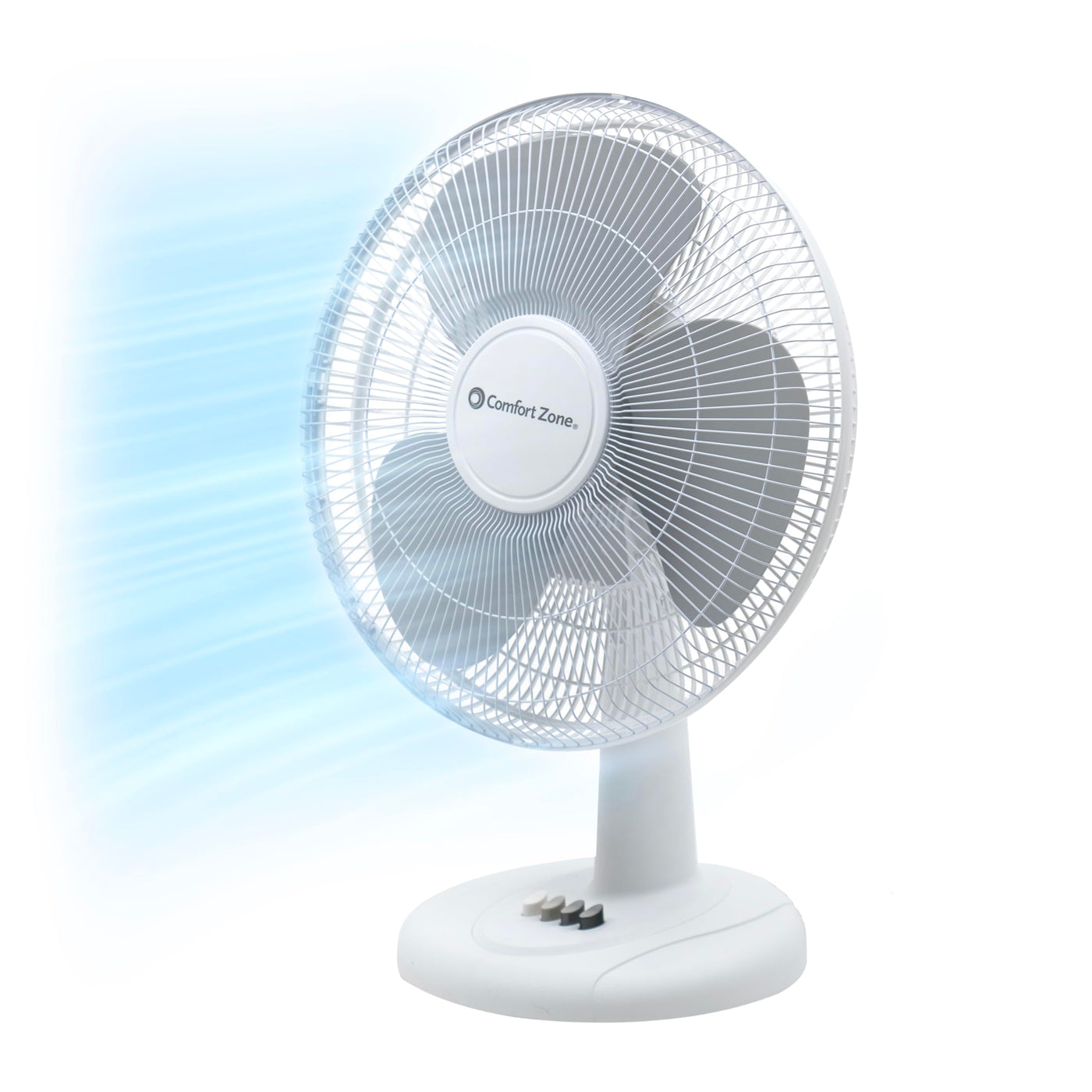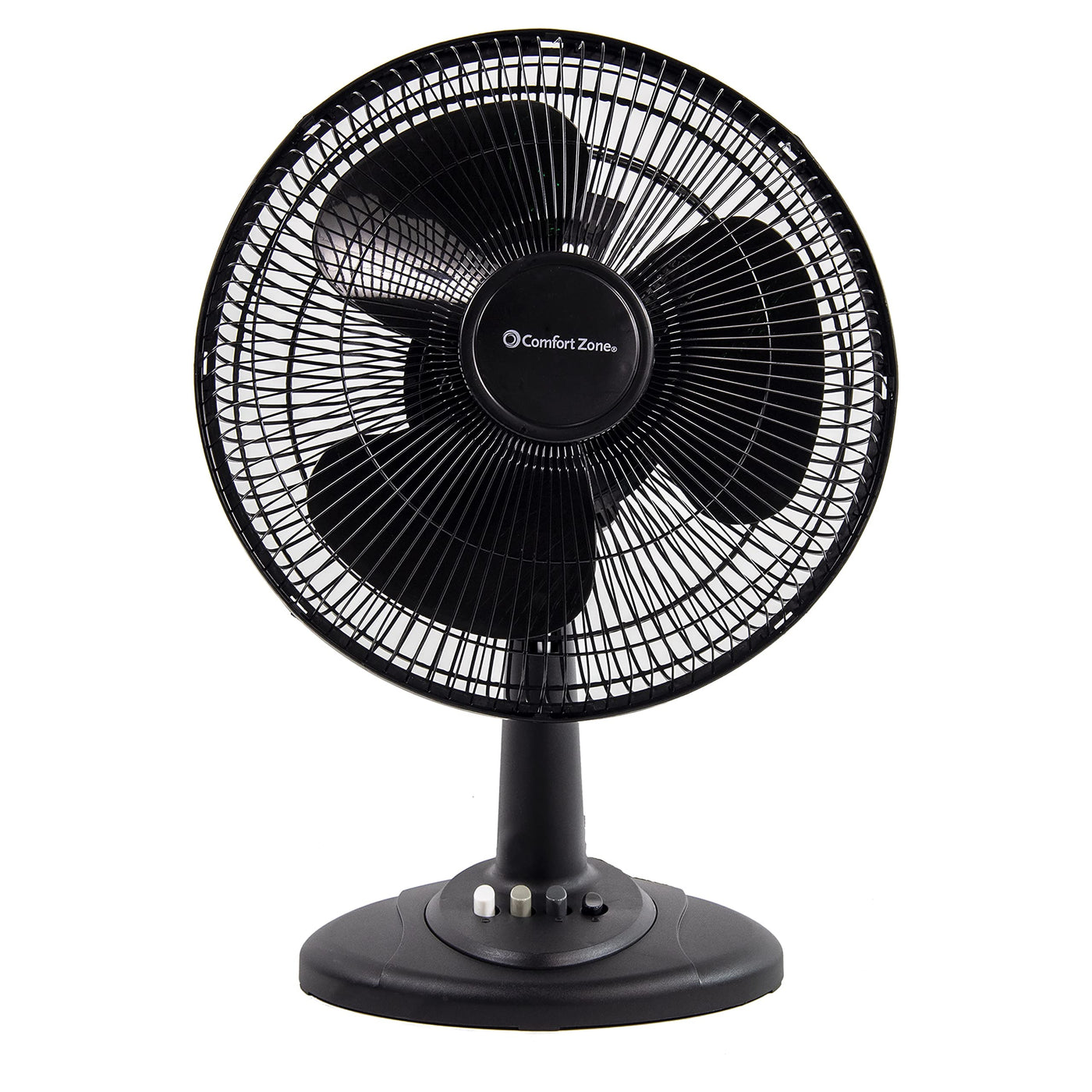 Versatile 3-Speed Air Outputwith A Three-Speed Air Output Design, This Comfort Zone 12 Oscillating Table Fan Can Switch From Gentle Air Circulation To A Brisk, Invigorating Breeze With The Push Of A Button This Versatile Table Fan Offers A Refreshing Breeze That Is Suitable For Hot Summer Days At Your Desk Or Humid Nights Beside Your Bedoscillating Design For Increased Air Circulationthis Quiet Table Fan Is Equipped With An Oscillating Fan Head, Which Sways From Side To Side To Create A Gentle Breeze Throughout The Entire Room The Oscillating Feature Is Ideal For Living Rooms, Family Movie Nights And Other Group Settings, Or Simply For Creating A Consistent Breeze In A Small Roomquiet Motor For Minimal Sounda Great Option For Those Who Need A Fan To Sleep, This Quiet Fan For Bedrooms Creates Very Little Noise, Even When On Its Fastest Speed Function It Provides A Gentle, Consistent Breeze While Creating Minimal Sound, Which Can Help Provide Relief On Hot And Humid Nightsadjustable Tilt For Added Controlto Ensure The Fan Is Always Blowing Air In The Direction You Want, This 3-Speed Oscillating Fan Includes An Adjustable Tilt, Which Can Be Pointed Up Or Down To Direct The Air Flow With More Precision This Provides Steady Relief From The Heat On Hot Summer Afternoons And Can Be Used As A Sleeping Fan With Added Control Over The Output