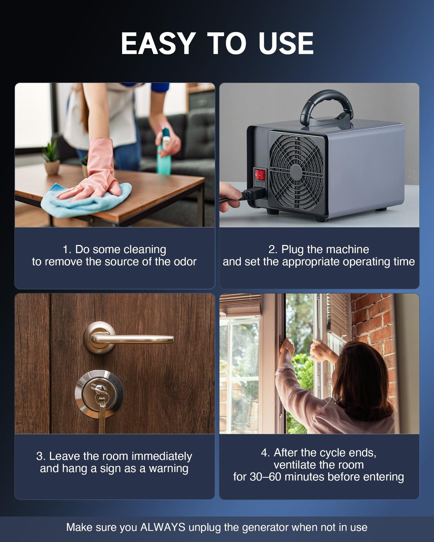 Q: How do I set the timer on the ozone machine?A: The ozone generator features a handy timer knob that allows you to easily set the duration for optimal purification, ensuring you can customize the operation based on your specific needs.