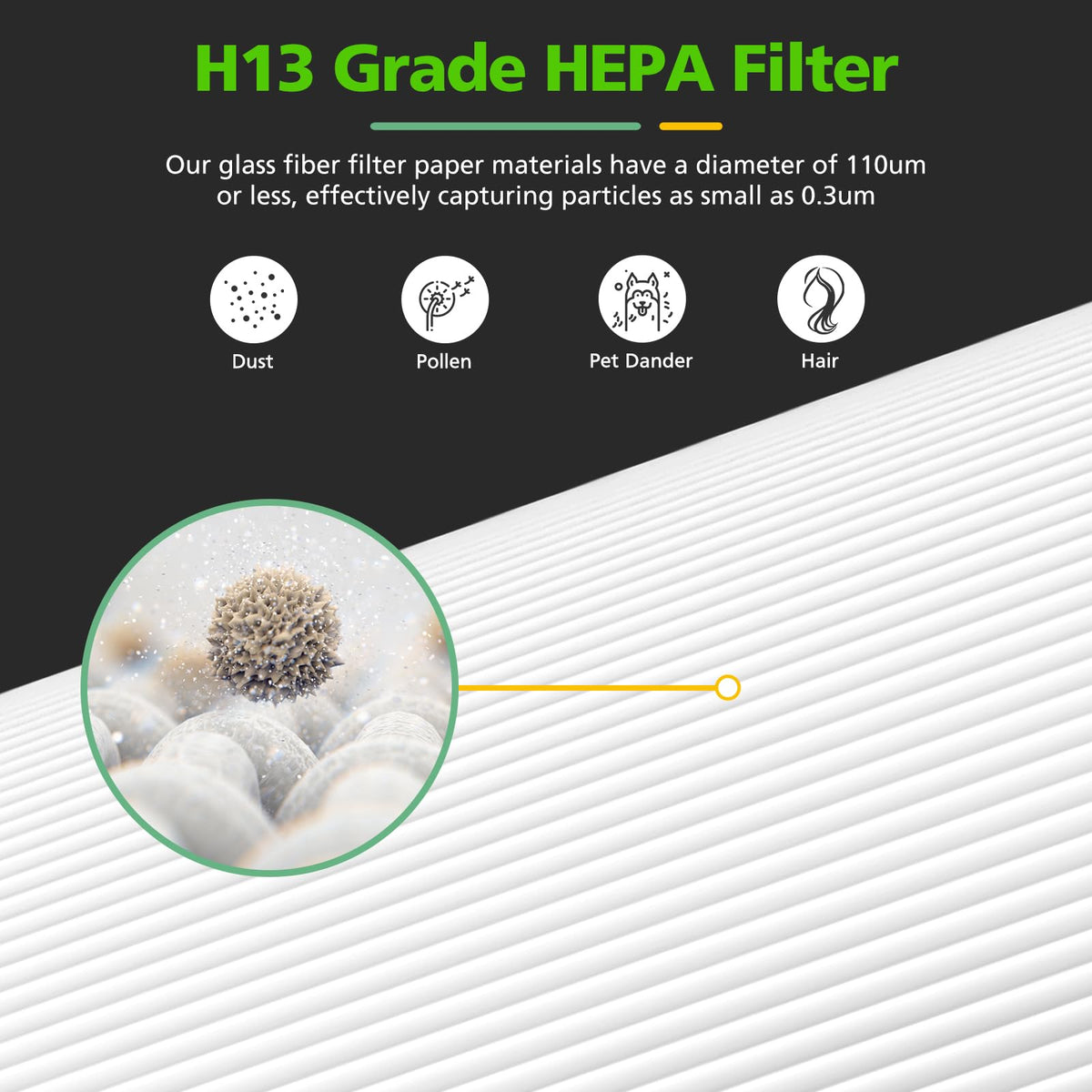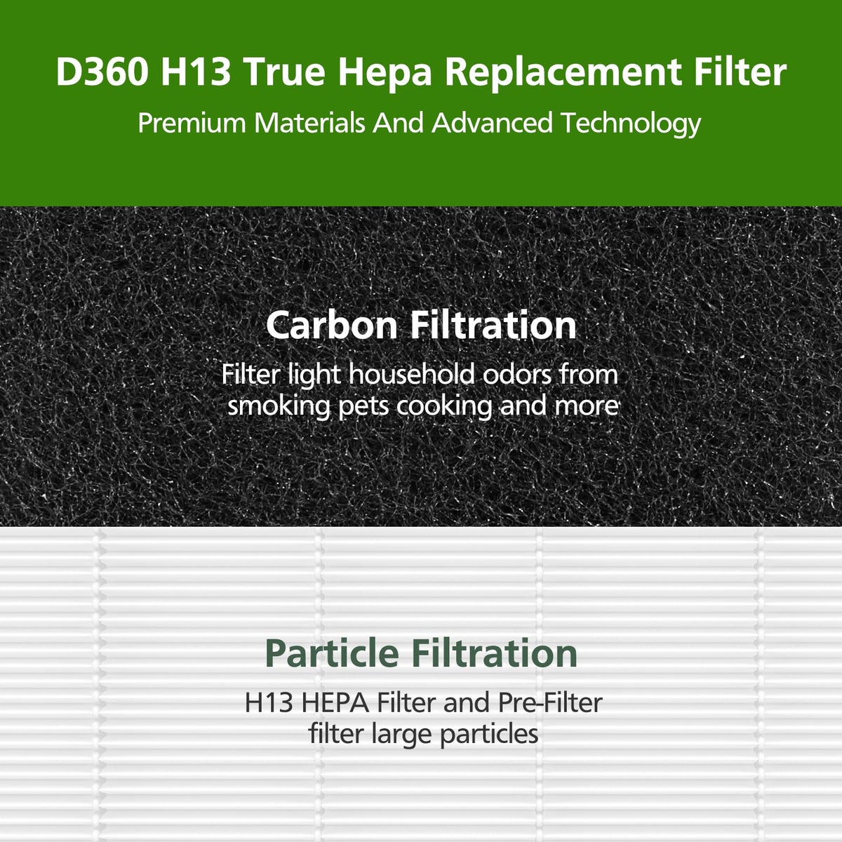 Q: What benefits does the D360 True HEPA Filter provide?A: The D360 True HEPA Filter offers superior air filtration, effectively capturing airborne particles and allergens. It significantly improves indoor air quality and absorbs unwanted odors from smoke, cooking fumes, and volatile organic compounds (VOCs).