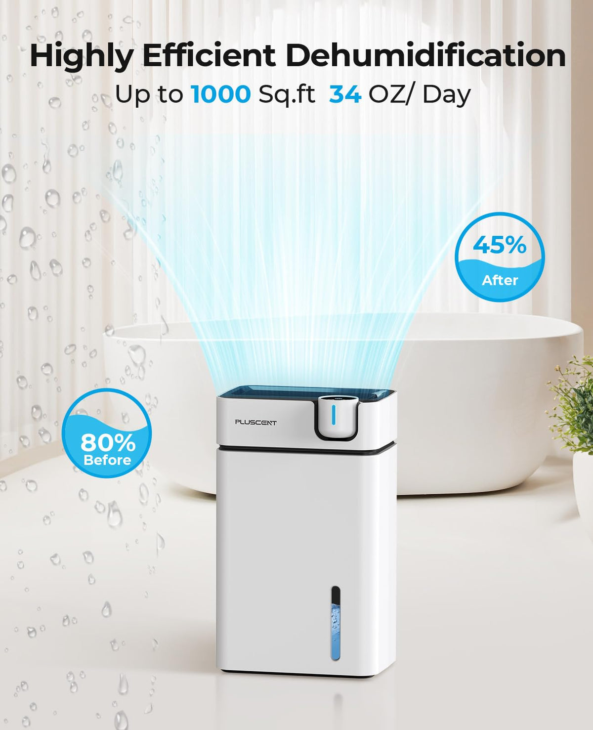 Q: How does the PLUSCENT dehumidifier improve air quality?A: The PLUSCENT dehumidifier efficiently extracts up to 34 oz of moisture daily, helping to reduce humidity levels in spaces up to 1000 sq.ft. This process not only prevents mold growth but also improves overall air quality, creating a more comfortable living environment.