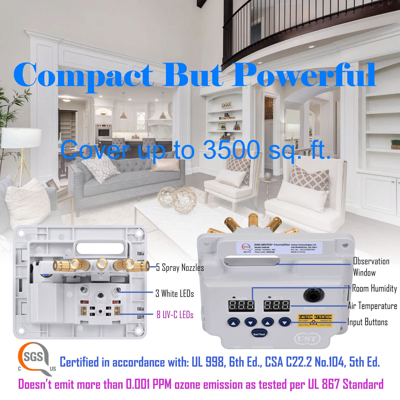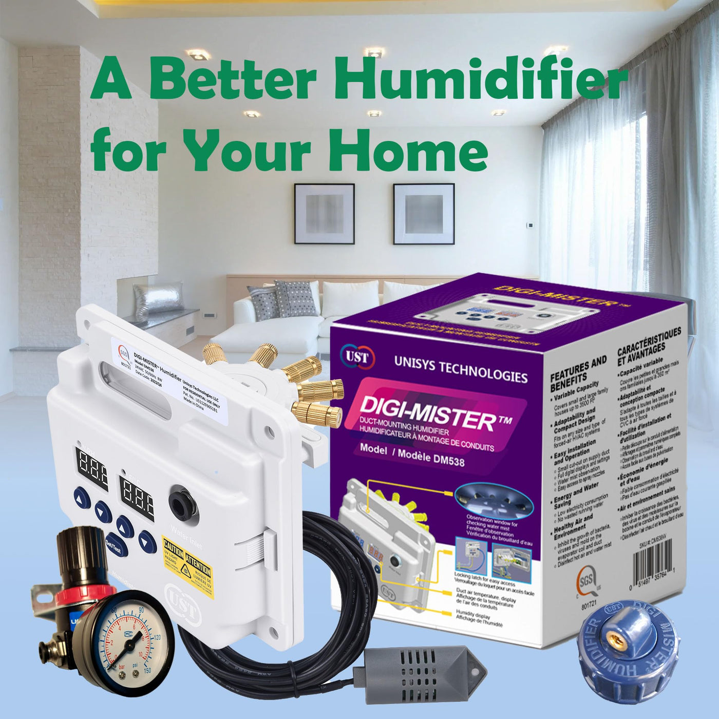Digi Mister Humidifier, Designed, Patented And Tested In The United States, Is Installed To Operate In Conjunction With The Forced-Air Heating, Ventilating, Air Conditioning (Hvac) Systems For Residential Houses Or Office Buildings. Once The Humidity Is Lower Than Desired And The Hot Air Temperature Rises To The Pre-Set Point, Atomized Water Mist Will Be Dispersed Into The Passing Warm Air By The Spray Nozzles. A Mini Vibration Motor On The Spray Nozzle Bracket Facilitates The Formation Of The Fine Water Mist. The Mist Will Evaporate Into The Warm Air And Then Be Carried Into Your Home By The Furnace Hot Air Flow. Eight (8) Uvc Leds Will Be Lit On When The Dm538 Humidifier Is Powered Up. Customers Can Have This Function Even In Summer When The Ac Is Running. Please Visit Our Website At Www.Unisys-Technologies.Com For More Detail Product Information.