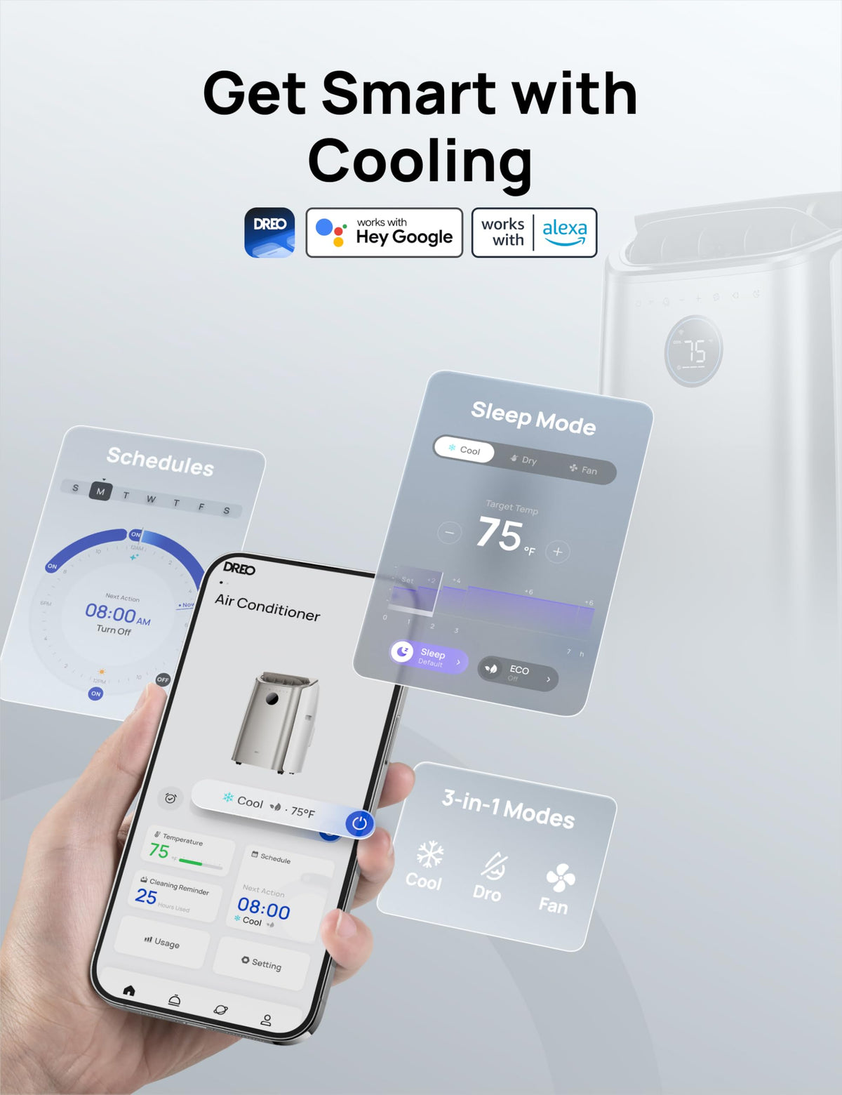 Go Big On Cooling Power: The Dreo Ac516S Portable Air Conditioner Brings Massive 14,000 Btu Ashrae Cooling Capacity That Reaches Up To 16 Ft. And Has A Maximum Recommended Area Of 400 Square Feet, Helping You Keep The Comfortable Temp In The Sweltering Days | Isolate Noise, Amplify Comfort: Featuring A New Noise Isolation System Around The Compresor, This Portable Air Conditioner Reduces Noise Down To A Minimum 46Db, Making It Ideal For Quiet Places Like Bedrooms And Offices | Drainage-Free Cooling: Bring Uninterrupted Cold Air To Your Room, Thanks To Dreo'S New Air Conditioner Design, A Dedicated Condenser And Water Pump Helps Transfer Excess Water And Reduces The Need For Drainage Compared To Traditional Portable Air Conditioners | Smart Cooling At Your Fingertips: Use Your Favorite Voice Assistant (Compatible With Amazon Alexa Or Google Home) Or The Fully-Featured Dreo App To Control Every Aspect Of Your Cooling Experience, From Multiple Modes To Fan Speeds And Timers, This Air Conditioner Has It All | Multiple Cooling Options: Get More Control Of The Way You Cool Thanks To The 3-In-1 Mode Including Settings For Cooling, Dehumidifying And Fan Control In One, Finding The Ideal Comfort Setting Is Easier Than Ever With The Dreo Ac516S Portable Air Conditioner