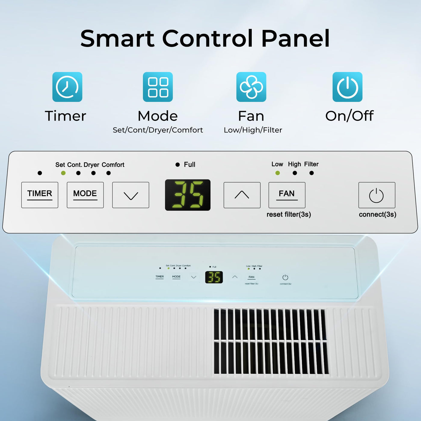 Q: What are the different operation modes available on this dehumidifier?A: This dehumidifier features four smart operation modes: SET, COMFORT, DRYER, and CONT. Each mode is tailored for specific use cases, such as maintaining comfortable humidity levels or quickly drying wet clothes.