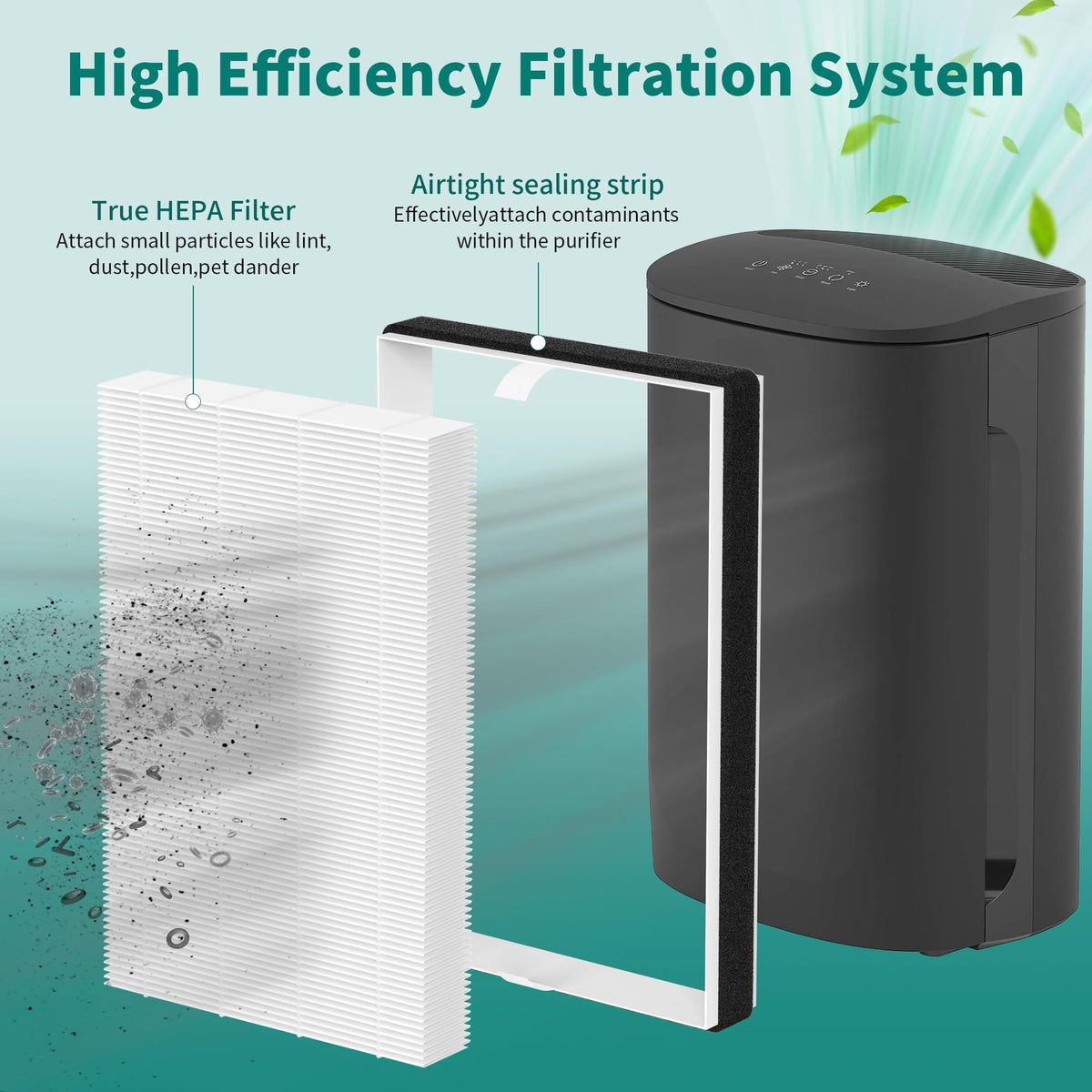 Q: What type of particles does the True HEPA filter capture?A: The H13 True HEPA filter captures up to 99.97% of particles as small as 0.3 microns, including wildfire smoke, cooking odors, pet dander, and pet hair, effectively improving indoor air quality.