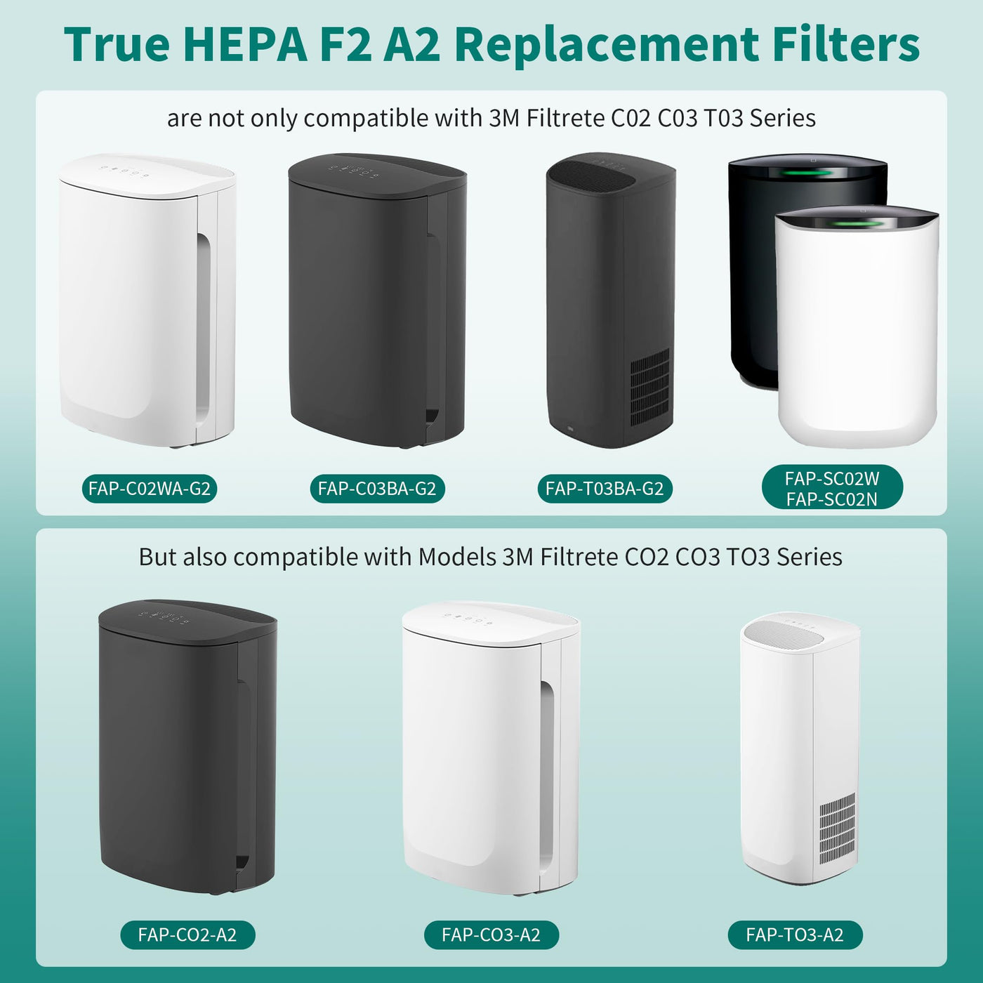 Q: What models are compatible with the FCFMY F2 A2 True HEPA Replacement Filter?A: The FCFMY F2 A2 True HEPA Replacement Filter is compatible with Filtrete F2 series air cleaner purifier models including FAP-C02WA-G2, FAP-C03BA-G2, FAP-T03BA-G2, FAP-SC02W, and FAP-SC02N, as well as Filtrete A2 series models FAP-C02-A2, FAP-C03-A2, and FAP-T03-A2.