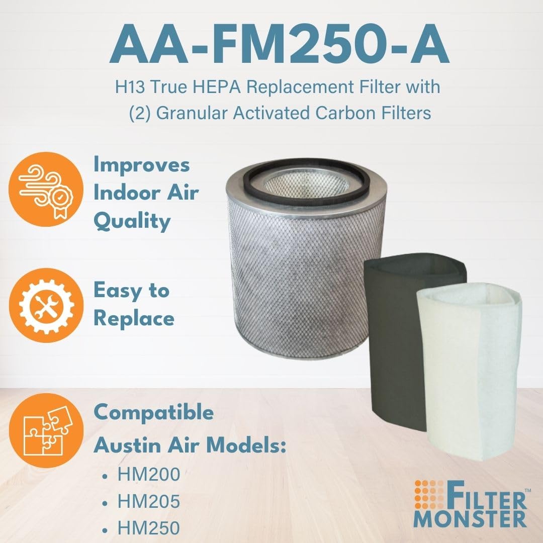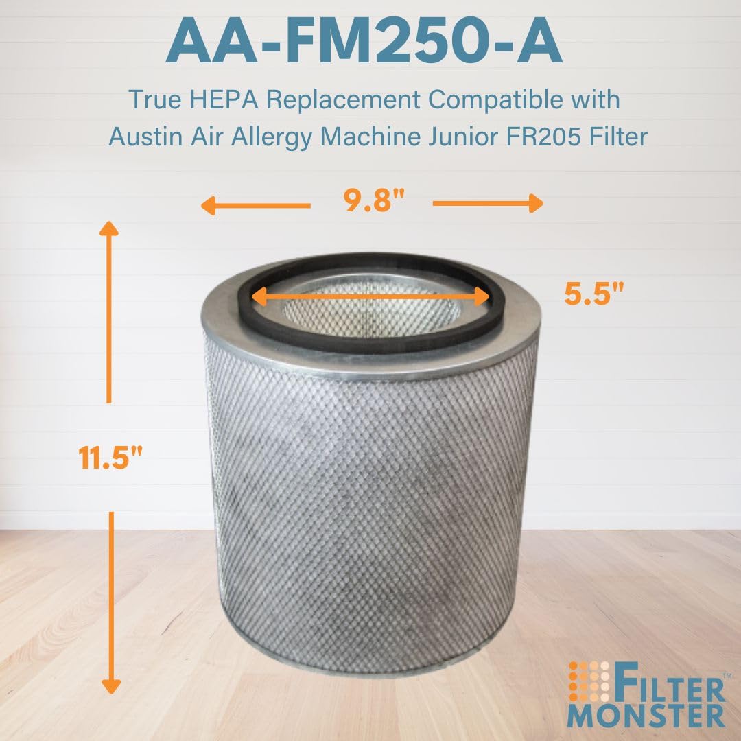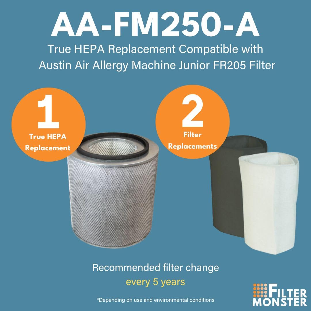 Filter-Monster Branded Replacement Filter Compatible With Austin Air Allergy Machine Junior Fr205 Air Purifier Filter True Hepa Filtration Removes Up To 9997% Of Airborne Particles As Small As 03 Microns In Size Including Dust, Smoke, Pollen, Pet Hair And Dander, Mold Spores And Dust Mites Carbon Pre-Filter Reduces Common Household Odors From Cooking And Cleaning, As Well As Extend The Life Of The Hepa Filter By Capturing Larger Particles Before Reaching Hepa Filter Recommended To Change Hepa Filter Once Every Five (5) Years For Maximum Efficiency, Or More Often In Harsh Environments Package Contains One (1) Hepa Filter And Two (2) Carbon Pre-Filters Engineered To Fit Austin Air Allergy Machine Junior (Hm205) Air Purifier Also Fits Austin Air Models Hm200, Hm250