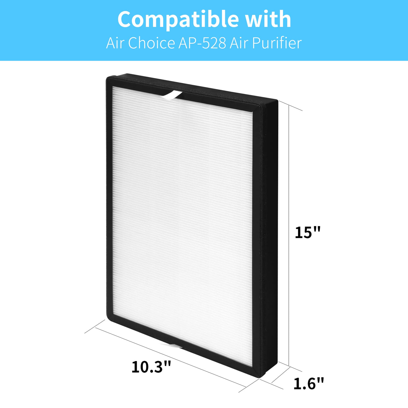 ?Compatible With?This Filter Is Compatible With Air Choice ( Ap-528) Purifier. | ?3-In-1 Filtration System?It Including A Fine Primary Filter, H13 True Hepa Filter And High Efficiency Activated Carbon Filter. | ?H13 True Hepa Filter?The True Hepa Filter Can Efficiently Filter Out 99.97% Of Particles As Small As 0.3 Microns, Like Dust, Dander And Pollen. | ?Activated Carbon Filter?Highly Effective Activated Carbon Can Help Reduce Indoor Odors From Smoke, Cooking And Pet Odors. | ?Package?2 True Hepa Filters Give You Surprises. And We Suggest Replacing The Filter Element According To Your Usage Situation.