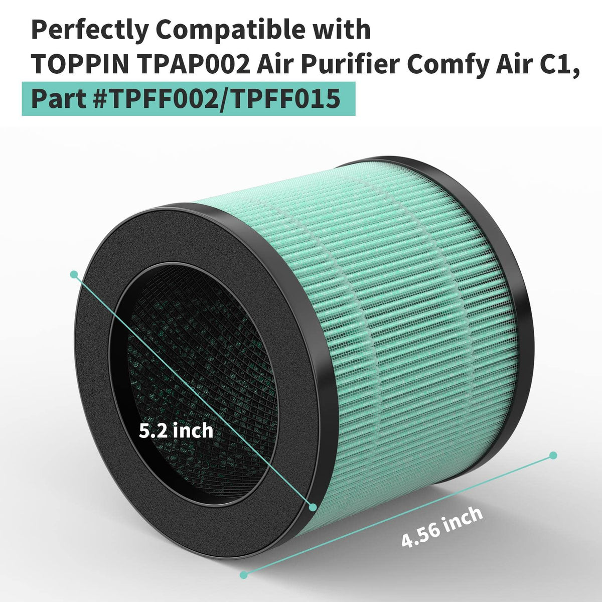 ?Compatible With? Perfectly Compatible With Toppin Tpap002 Purifier Comfy Air C1, Part # Tpff002. | ?Package?4-Pack True Hepa Filters Bring You Surprises. | ?4-In-1 Design? The Filter Include Nano-Silver Coating Filter, Pre-Filter, H13 Grade True Hepa Filter And High Efficiency Activated Carbon Filter. | ?H13 Grade True Hepa Filter? True Hepa Filter Is Able To Capture 99.97% Particles As Small As 0.3 Microns. | ?Activated Carbon Filter? Highly Effective Activated Carbon Can Help Reduce Indoor Odors From Smoke, Cooking And Pet Odors.
