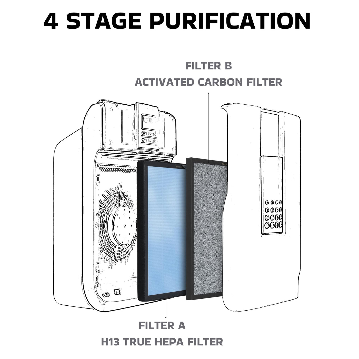 Q: How does the 4-stage filtration system work in the HSP001 filter?A: The HSP001 features a 4-in-1 filtration system that includes a Cold Catalyst filter, Activated Carbon filter, HEPA Pre-filter, and Premium TRUE H13 HEPA Filter, effectively capturing pollutants and improving air quality.