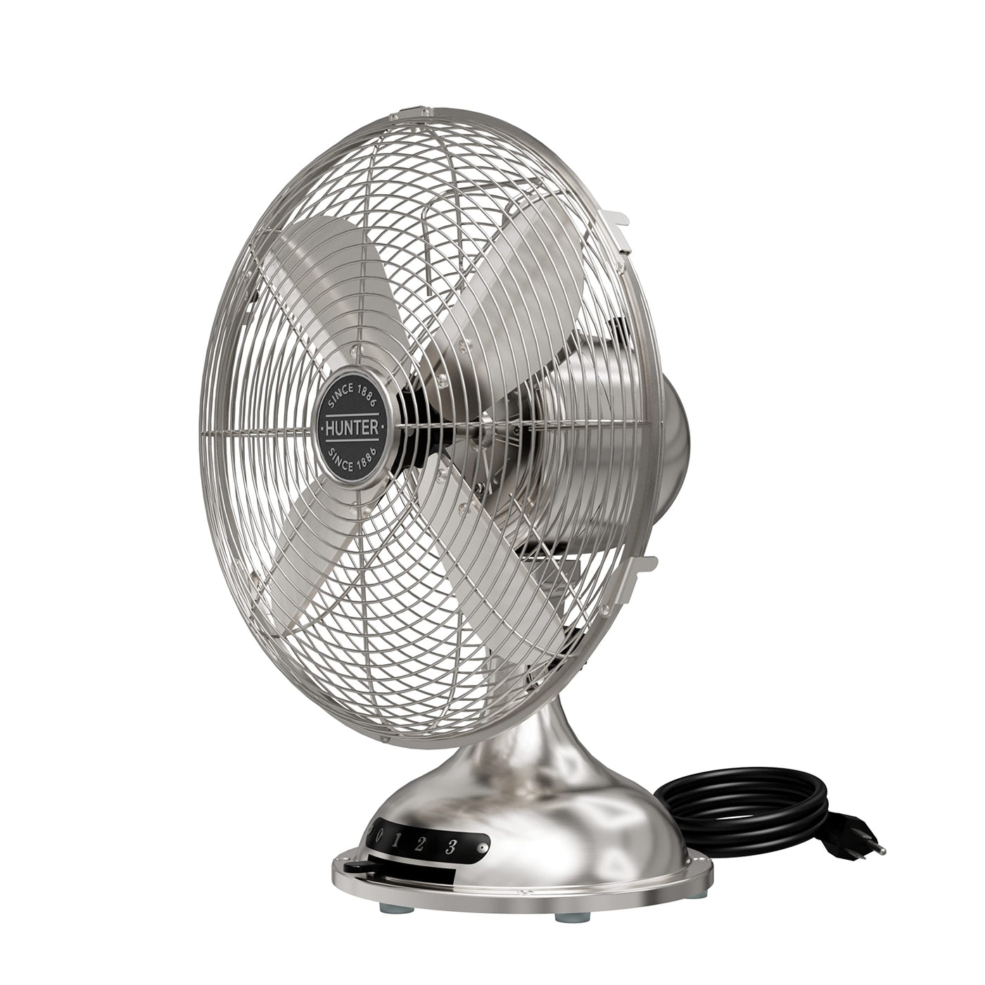 Q: What are the key features of the Hunter Classic D12 Portable Desk Fan?A: The Hunter Classic D12 Portable Desk Fan features a vintage design with a brushed nickel finish, three-speed settings for customizable airflow, an oscillating function for wider air distribution, an easy-carry handle for portability, and a non-slip base to prevent scratches and sliding.