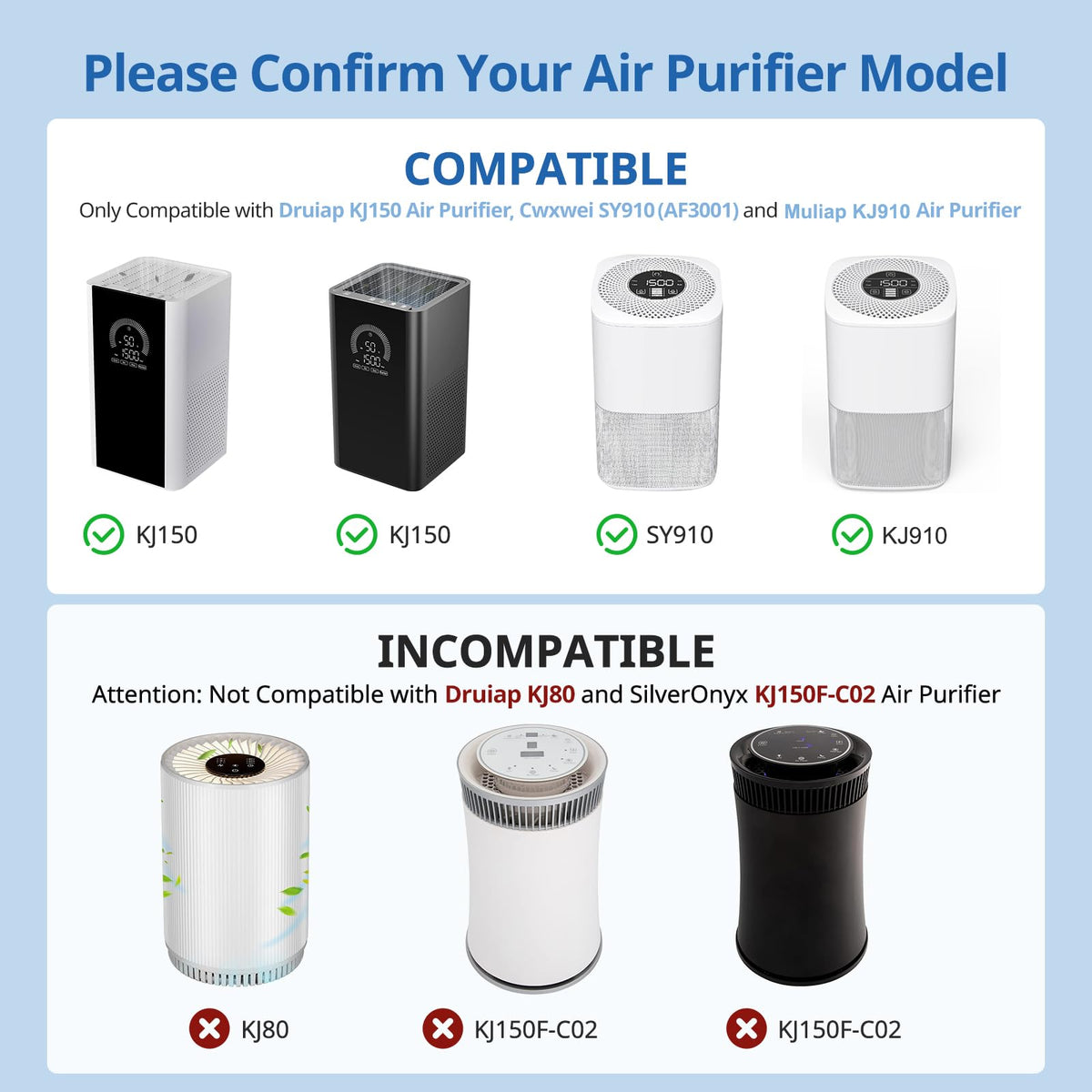 Q: Is the KJ150 SY910 replacement filter compatible with my air purifier?A: Yes, the KJ150 SY910 replacement filter is compatible with the Druiap KJ150 Black+White Air Purifier, Muliap & Generic KJ910, and Cwxwei SY910 (AF3001) Air Purifier. Please note that it is not compatible with the KJ80 model.