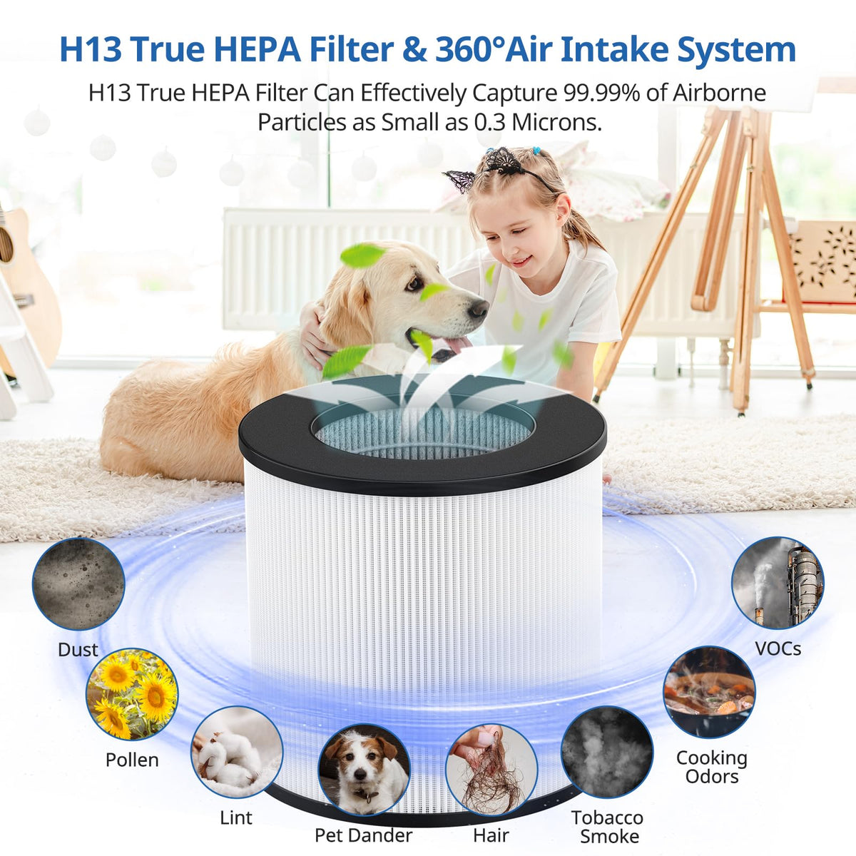 Q: What are the main features of the KJ150 SY910 filter?A: The KJ150 SY910 filter features a 3-stage filtration system, which includes a Pre-filter for larger particles, an H13 True HEPA filter that captures 99.99% of airborne particles down to 0.3 microns, and a High-Efficiency Activated Carbon Filter to absorb unpleasant odors.