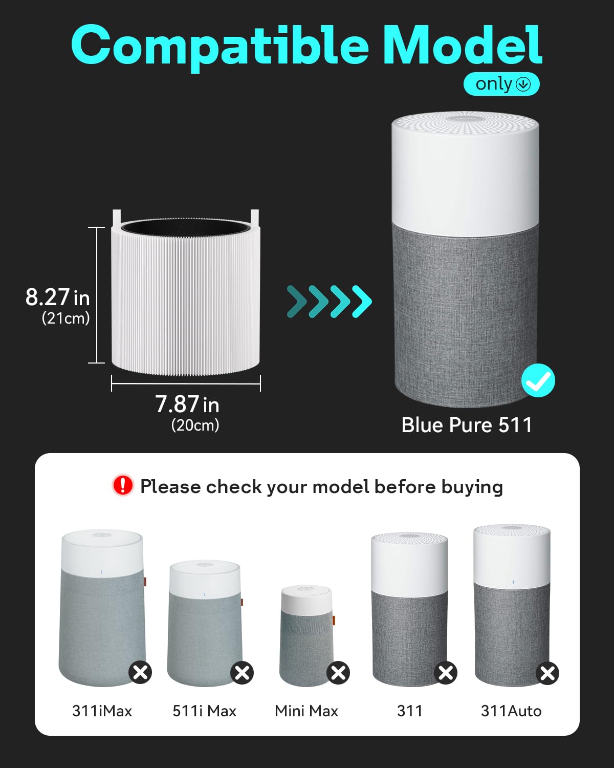 Q: Is the Leemone 2 Pack Blue Pure 511 Filter compatible with all Blueair air purifiers?A: No, the Leemone 2 Pack Blue Pure 511 Filter is specifically designed to fit only the Blueair Blue Pure 511 Air Purifier. It is not compatible with models such as 511i max, 511 Auto, 211+, and others. Please verify your model before purchasing.