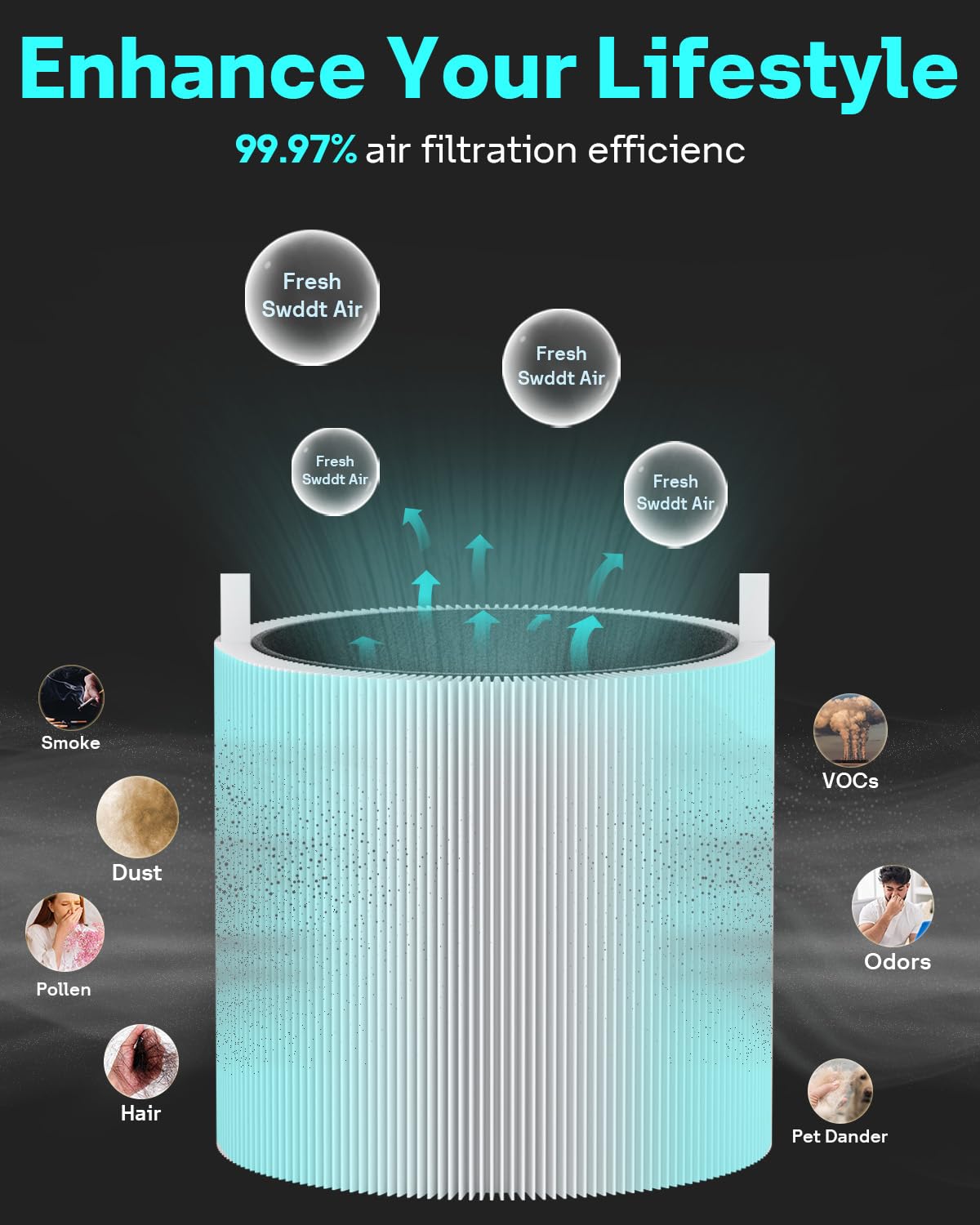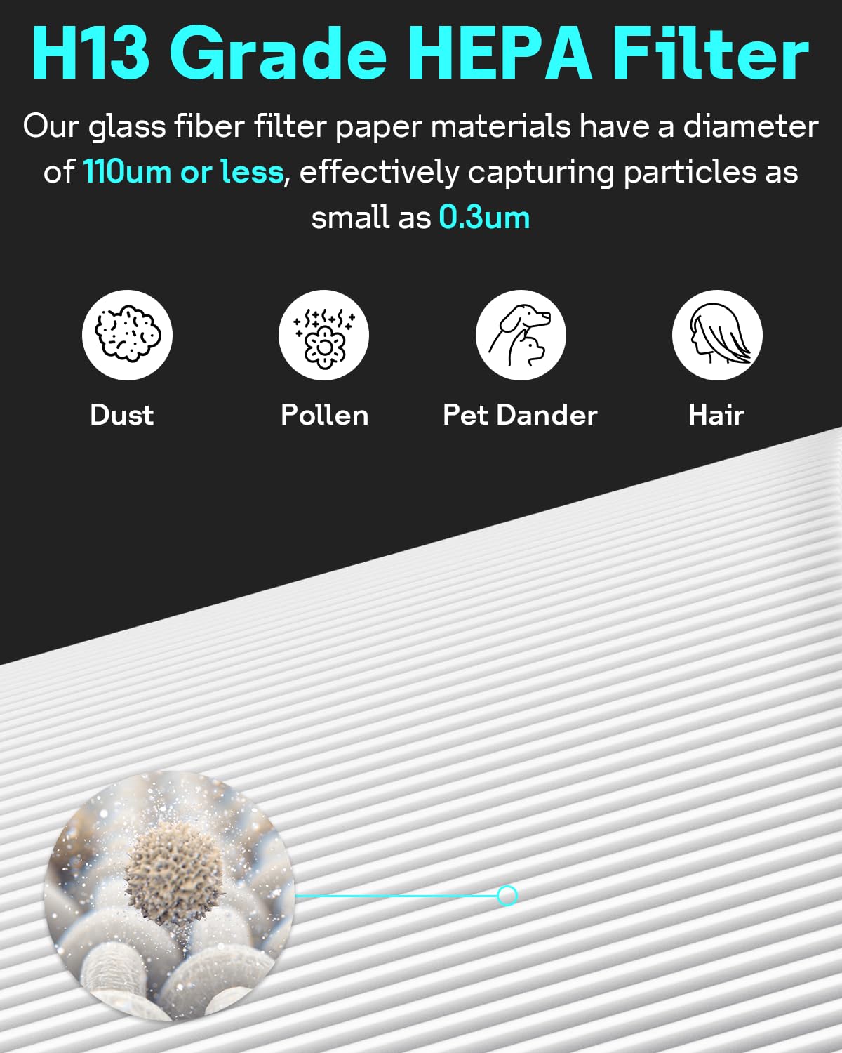 Q: What types of particles does the H13 True HEPA filter capture?A: The H13 True HEPA filter effectively captures 99.97% of airborne particles as small as 0.1 microns. This includes common allergens like pet dander, pollen, and dust, making it ideal for improving indoor air quality.