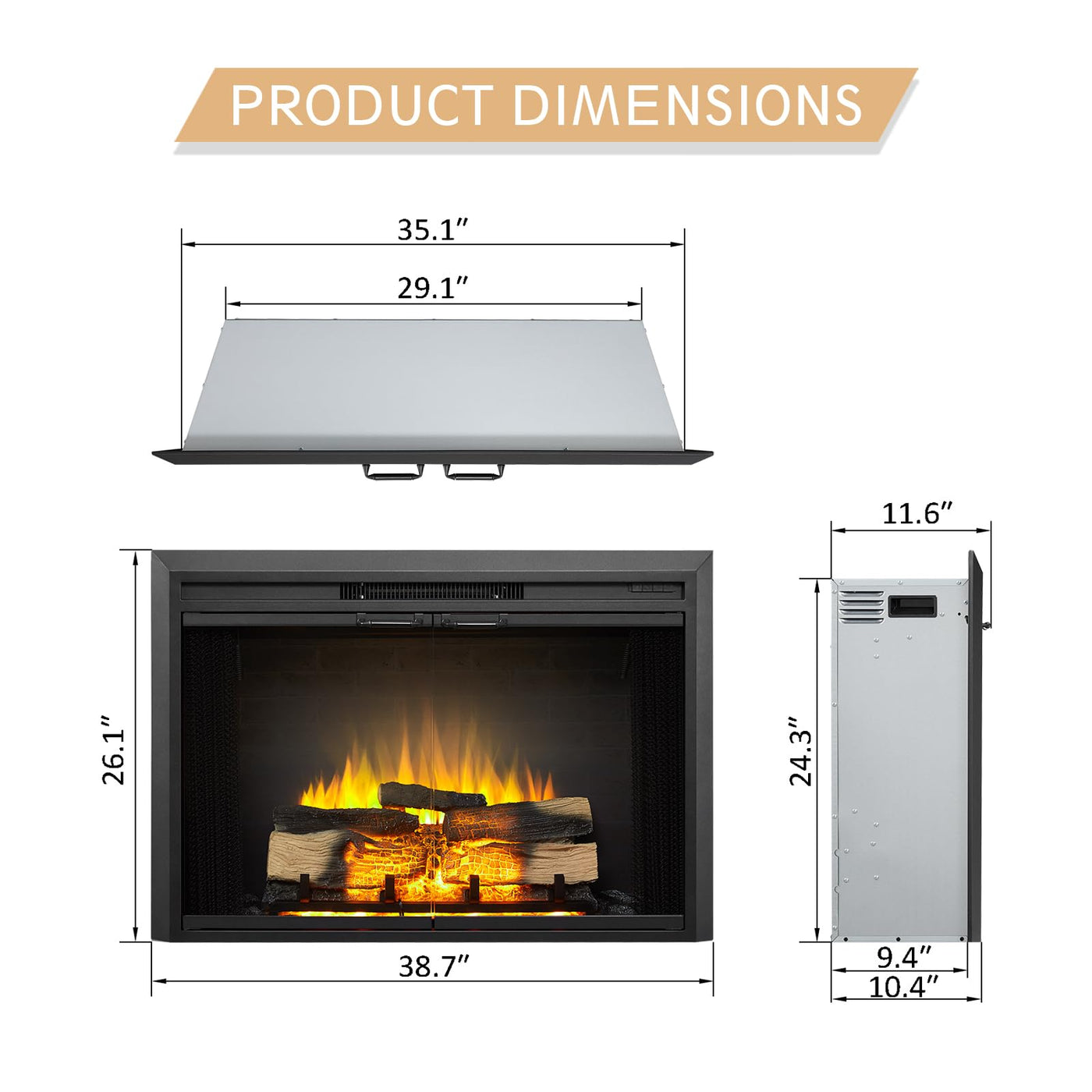 Q: What are the dimensions of the LegendFlame Damon 39" Electric Fireplace Insert?A: The dimensions of the LegendFlame Damon Electric Fireplace Insert are 38.7 inches in width, 26.1 inches in height, and 11.6 inches in depth.