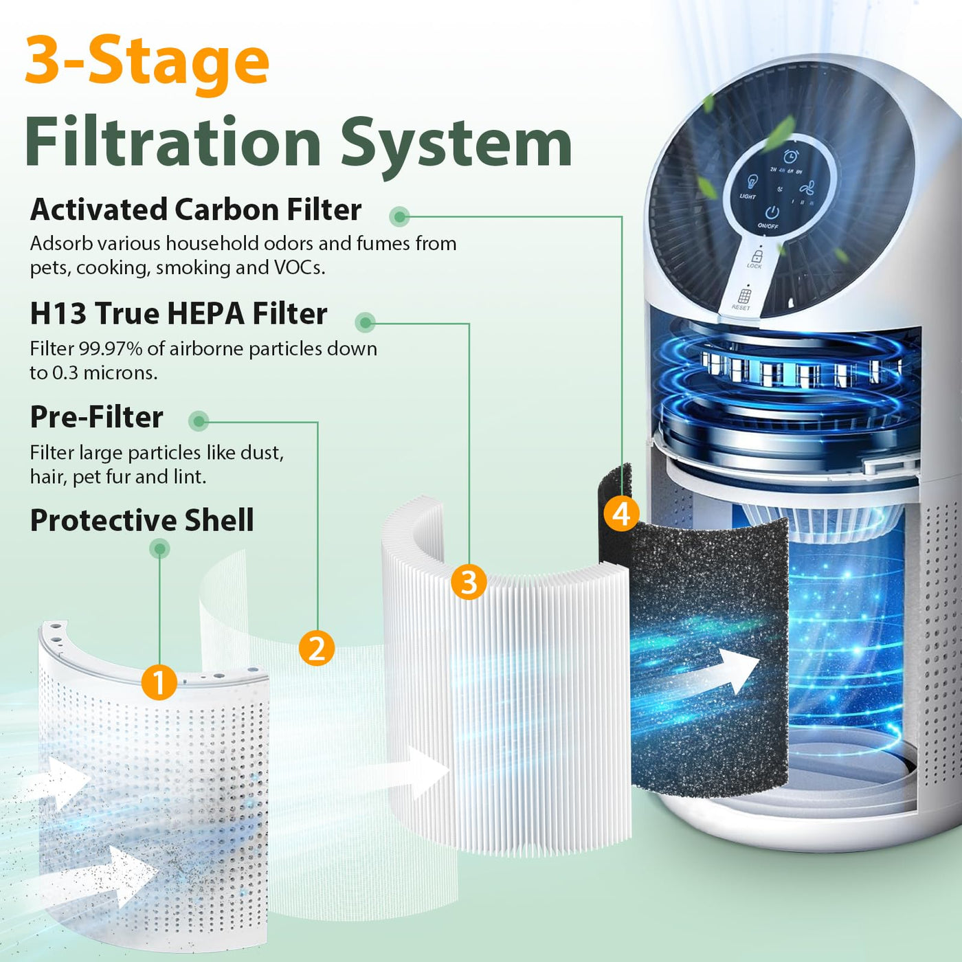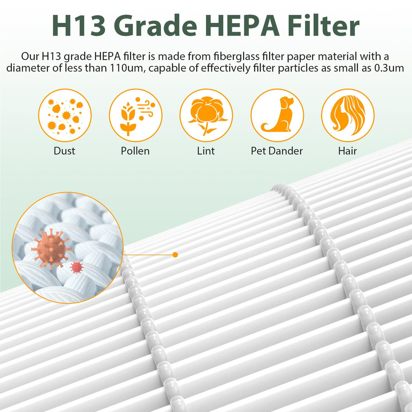 Q: What is the filtration capability of the H13 True HEPA filter?A: The H13 True HEPA filter can capture 99.97% of airborne particles down to 0.3 microns in size, including fine dust, pollen, pet dander, and smoke. This makes it highly effective at improving indoor air quality.
