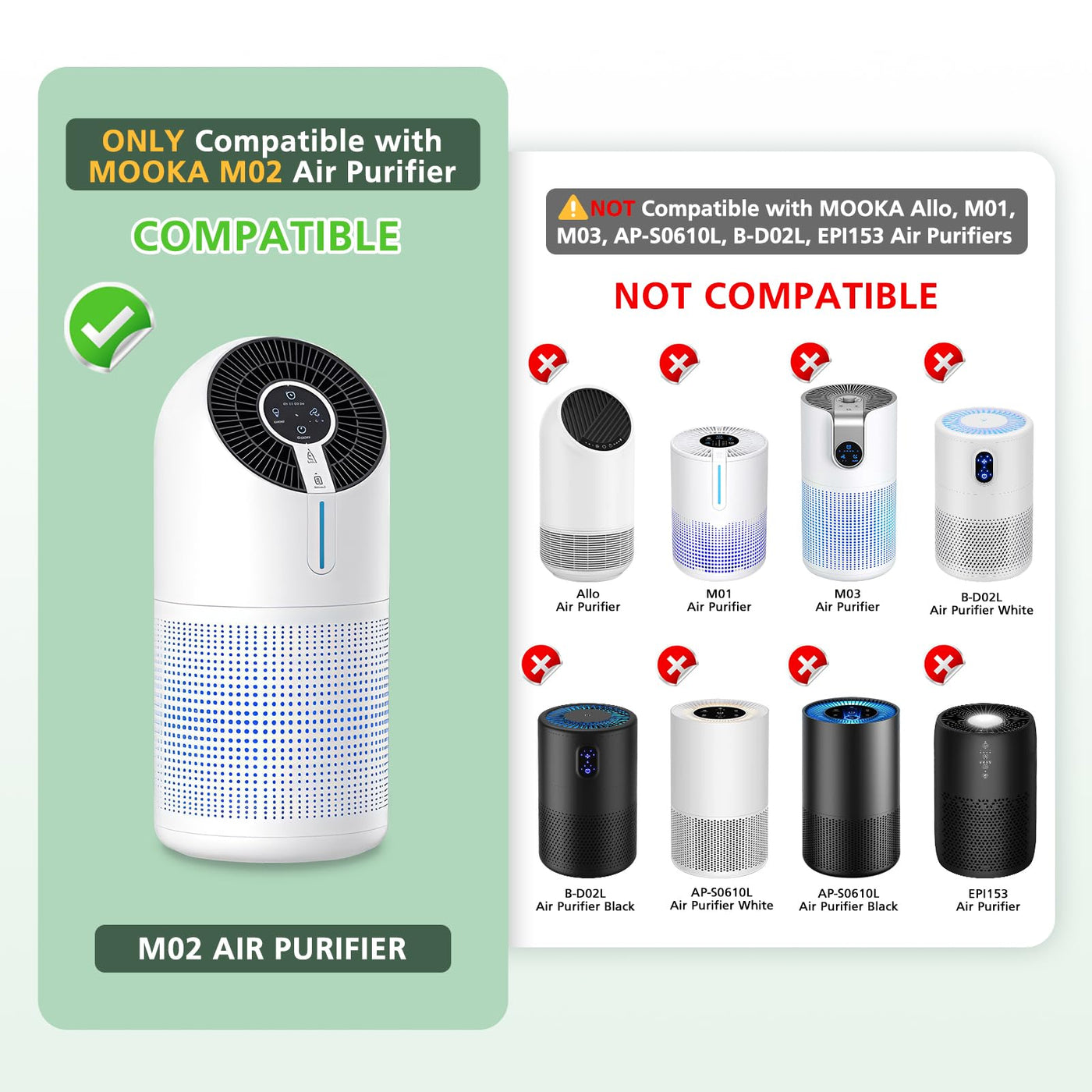 Q: Is the M02 replacement filter compatible with all MOOKA air purifiers?A: No, the M02 replacement filter is only compatible with the New MOOKA M02 Air Purifiers. It is not suitable for older versions or other models such as MOOKA Allo, M01, M03, M05, AP-S0610L, and B-D02L. Please check your machine model before ordering.