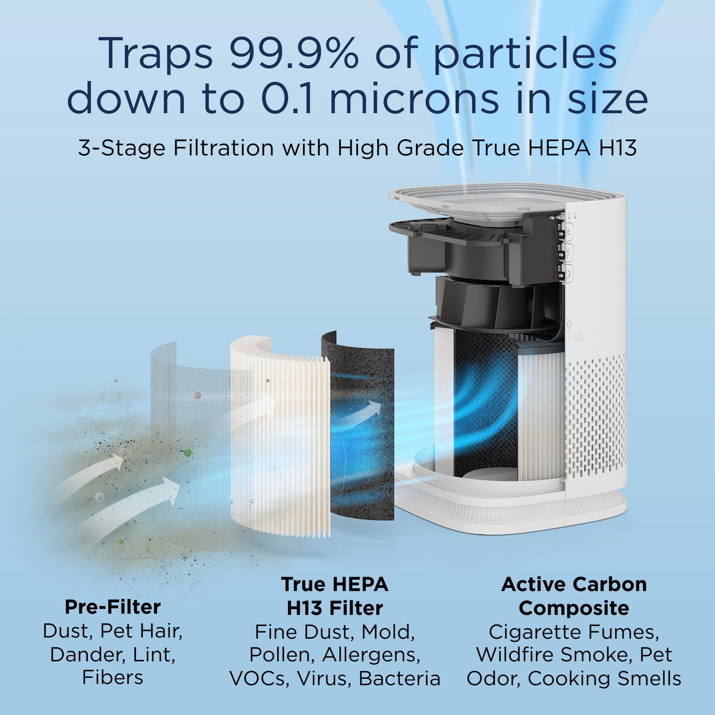 Q: How does the True HEPA H13 filter work?A: The True HEPA H13 filter in the Medify MA-14 is designed to remove 99.9% of particles as small as 0.1 microns, including allergens, dust, smoke, and pet dander, ensuring cleaner air in your environment.