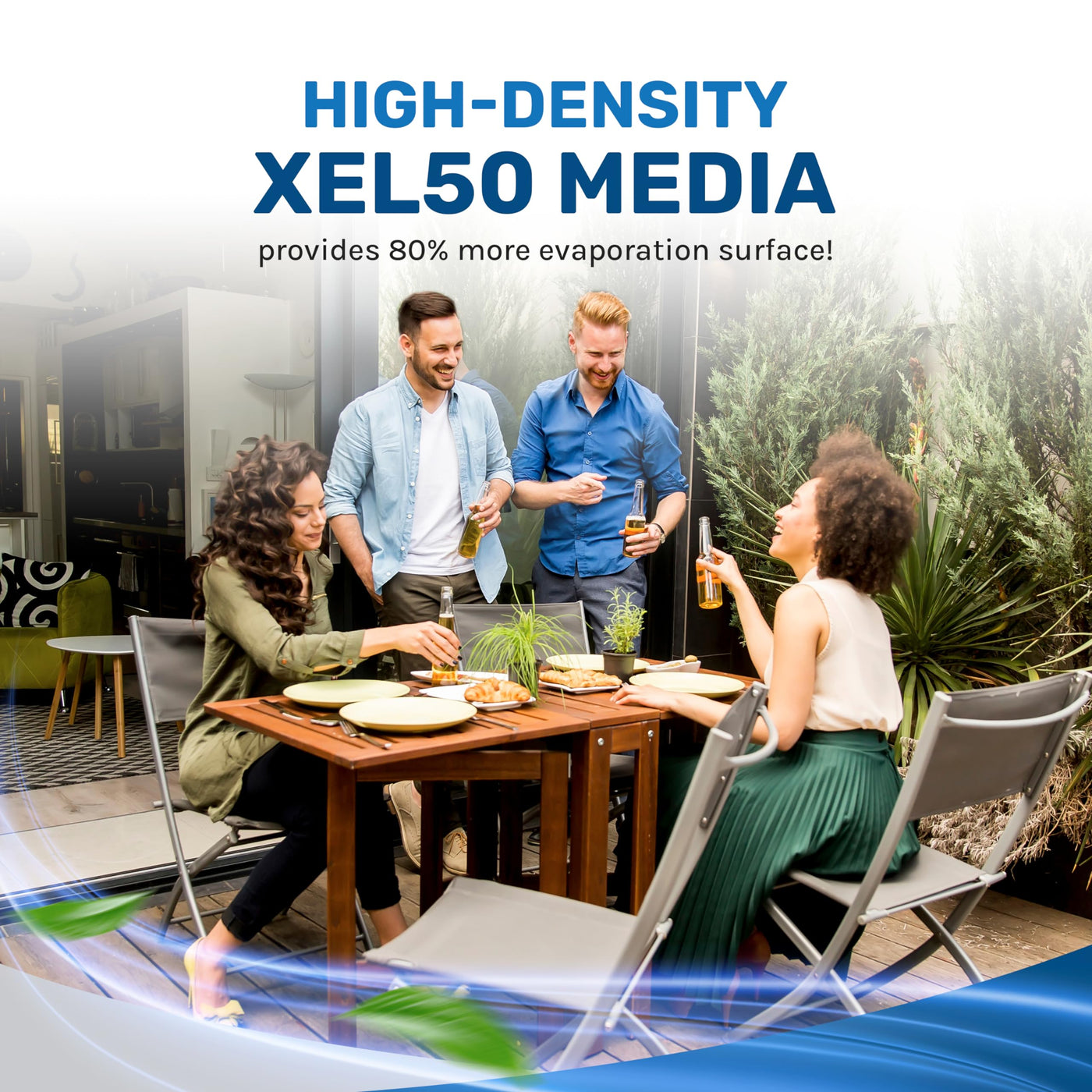 The Hessaire 5,300 Cfm Evaporative Cooler Is Compact In Size, Pleasing In Aesthetics And The Performance Exceeds Coolers Of A Much Larger Size. This Performance Is Achieved Through Expanding Air-Intake Areas To The Hi-Density Xel50 Rigid Media. These Coolers Have 3 Media Panels Instead Of A Single Panel Found On Most Mobile Coolers. 3 Panels Allow More Air-Intake Area And Reduce Pre-Rotation Of The Air To The Prop, Which Translates Into Lower Static Pressure And More Efficient Air Delivery To The Prop. The Hi-Density Xel50 Media Provides 80% More Evaporation Surface Compared To Regular Density Media. This Means Higher Evaporation Efficiency And Cooler Temperatures. Note: This Unit Is Not An Air Conditioner And Therefore Uses Much Less Energy And Saves More On Electricity Costs. It Is Best Used In Dry Climates Or Open Spaces. Leave Window/Door Open To Limit The Rise Of Humidity And Keep Better Air Ventilation In The Room.