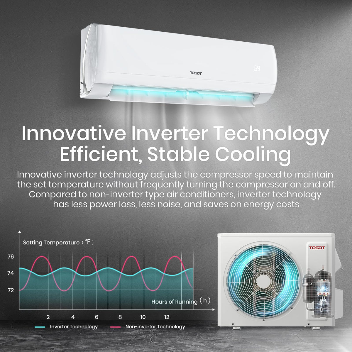 Q: What is the energy efficiency rating of the TOSOT Mini Split AC, and how can it save on energy costs?A: The TOSOT Mini Split AC features a SEER2 rating above 20, which ensures exceptional energy efficiency. This rating can help you save up to 62% on energy costs compared to lower-rated units, making it a cost-effective cooling and heating solution.