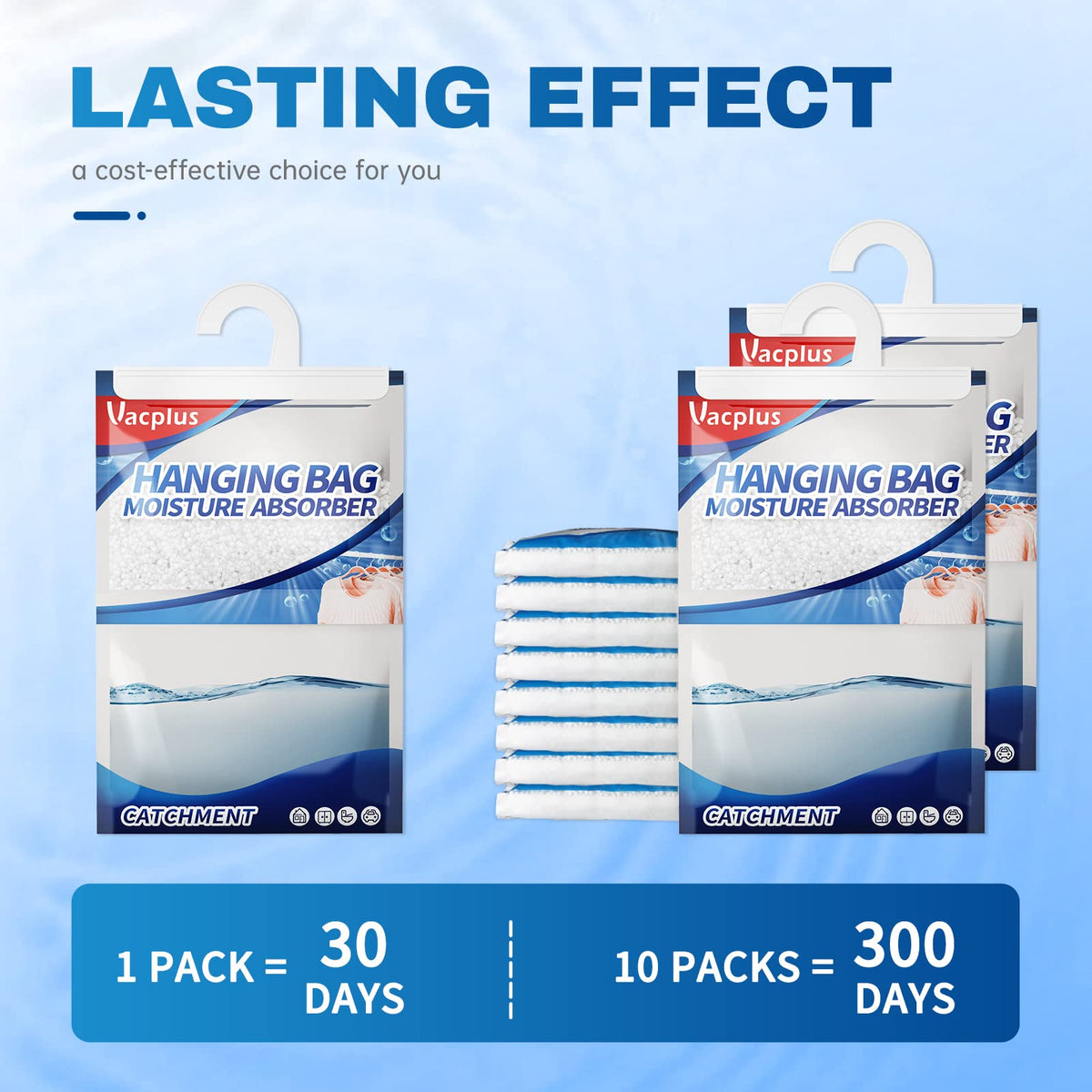A Comfortable Living Environment Is Very Important To Everyone Nobody Wants To Live In The Soppy Room A Moisture Absorber Box Could Be Necessary For A Humid Environment Vacplus Closet Dehumidifier Could Provide Good Protection For Your Clothes By Trapping Humidity In Packs The Collected Liquid Would Drip Into The Individual Moisture Collecting Bag, Where You Could Clearly See The Dehumidification Process You Could Simply Replace A New Pack When All Of The White Calcium Chloride Particles Are Dissolved Moreover, This Product Can Be Hung Unlimitedly This Design Makes It An Ideal Moisture Absorber For Rooms, Such As Bathrooms, Kitchens, Laundry Rooms, Touring Cars, Boats, And Basements You Could Also Hang This Product Beside The Rv Window In Your Car For Dehumidification All You Need To Do Is Hanging The Moisture Absorber Bag Up In Your Desired Places Vacplus Hanging Moisture Absorber Bag Is Not Only A Dehumidifier But Also A Reliable Closet Deodorizer The Calcium Chloride Particles Inside The Pack Could Absorb The Extra Moisture, And Eliminate Unpleasant Smell From Your Room Vacplus Moisture Absorber & Odor Eliminator Absorb Is Defintely Your Great Dehumidifying Assistant