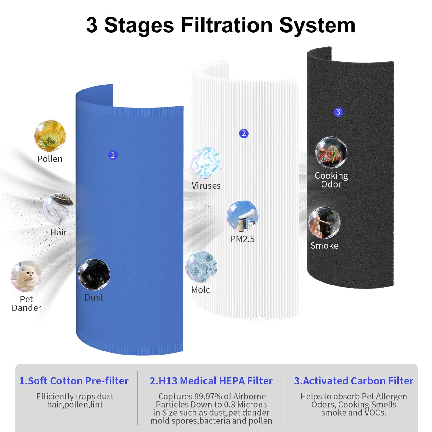 Q: What type of filtration does this product offer?A: This product features premium H13 HEPA filtration, combined with an activated carbon layer that effectively absorbs odors, gases, and VOCs, promoting a healthier living environment.