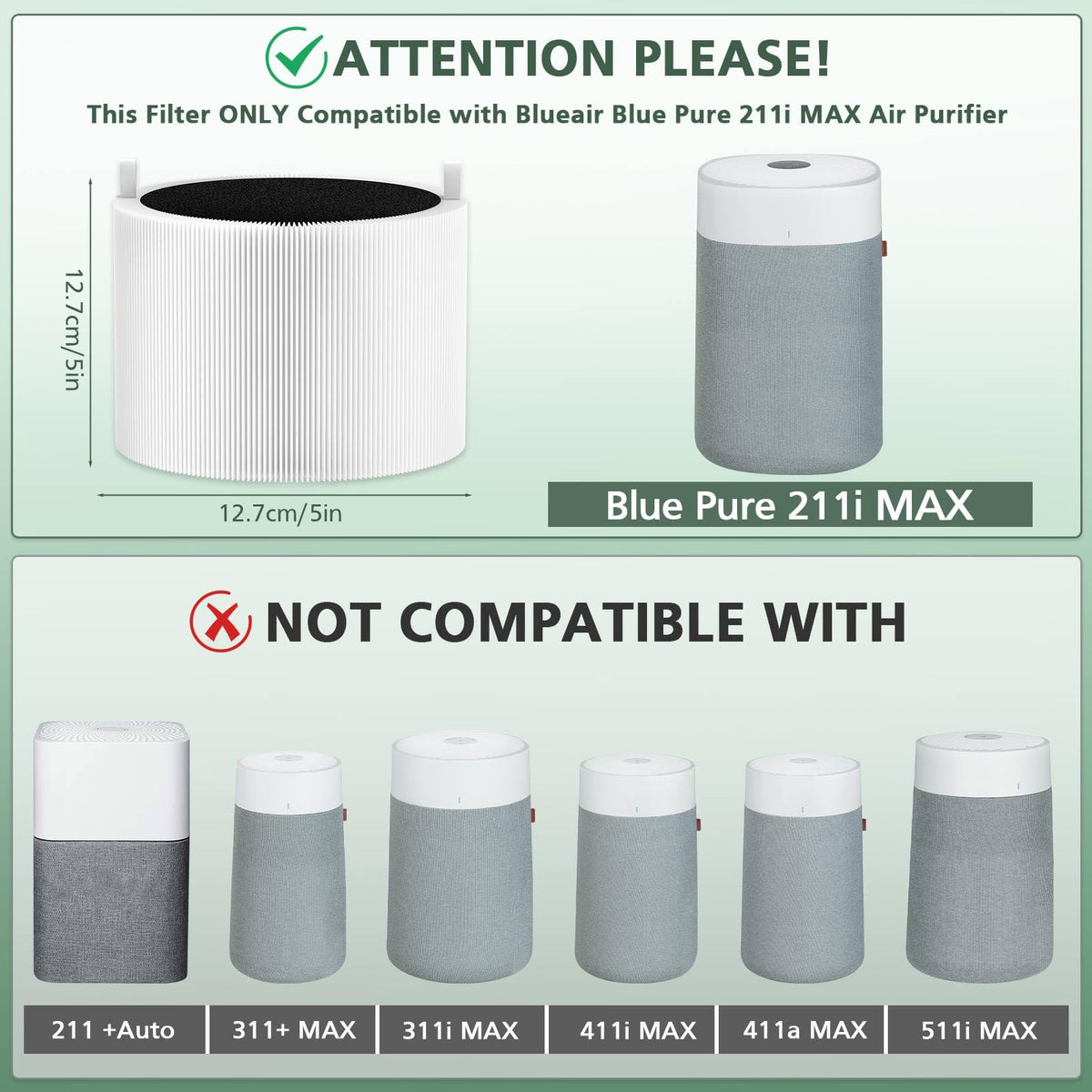 Q: Is the 211i Max Replacement Filter compatible with other BLUEAIR air purifiers?A: No, the 211i Max Replacement Filter is specifically designed for the BLUEAIR Blue Pure 211i Max Air Purifier. It is not compatible with models such as 211+, 211+ Auto, 411i Max, 411ia, 511, 311, or 121. Always check your model number before purchasing.