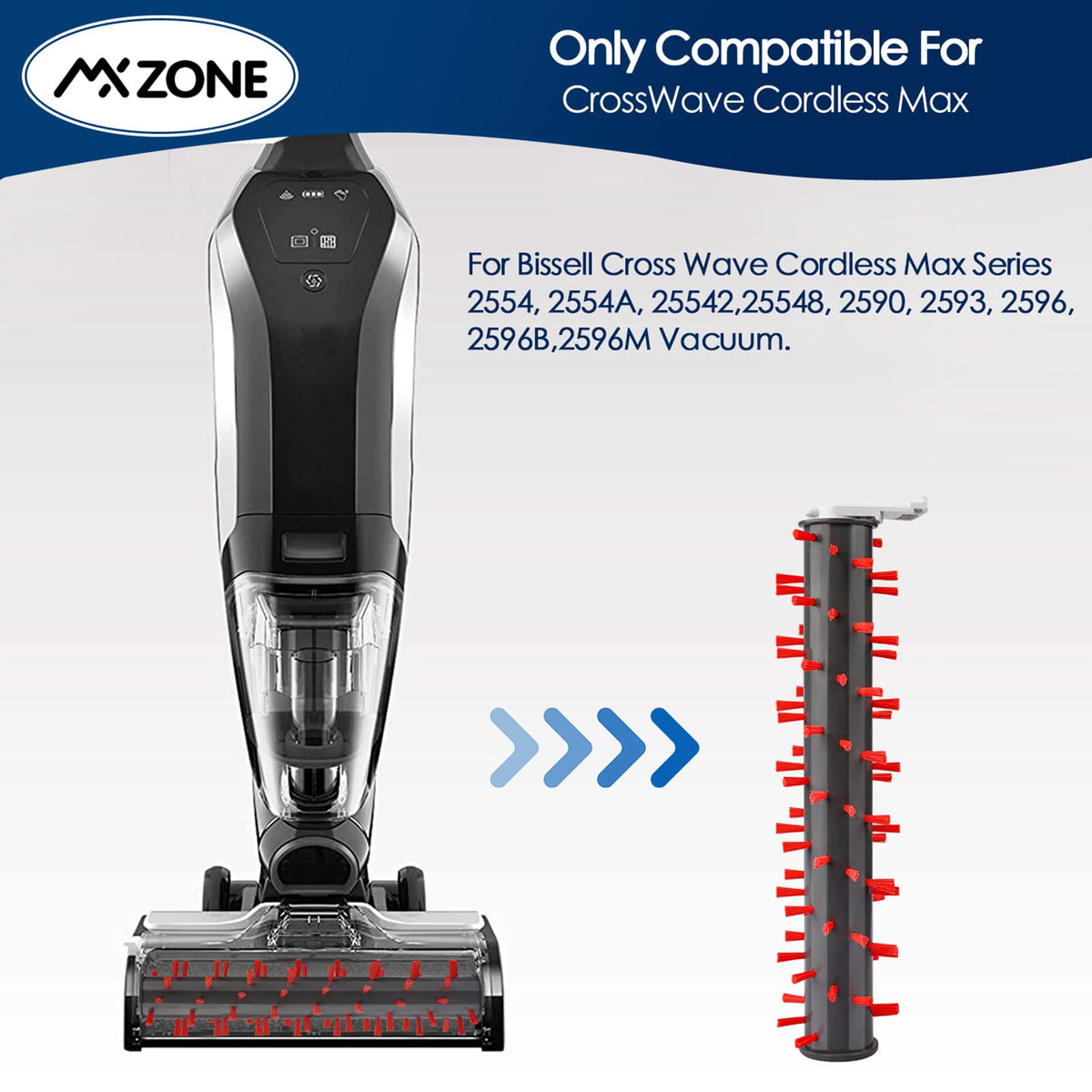 Q: Is the MXZONE Carpet Brush Roll compatible with my Bissell vacuum?A: The MXZONE Carpet Brush Roll is compatible with Bissell CrossWave Cordless Max Series models 2554, 2554A, 25542, 25548, 2590, 2593, 2596, and Bissell Crosswave HydroSteam Plus Series models 35151, 3515, 35152, 3513, and 3518. However, it is not compatible with Bissell CrossWave models 1785G, 1785B, 1785F, and many others.