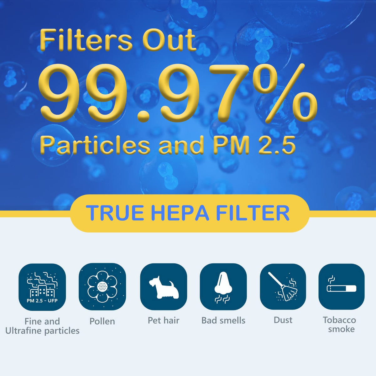 Q: What particles can the D480 True HEPA filter remove?A: The D480 True HEPA filter is capable of removing 99.97% of particles as small as 0.3 microns, including dust, pollen, smoke, odors, pet hair, and VOCs.