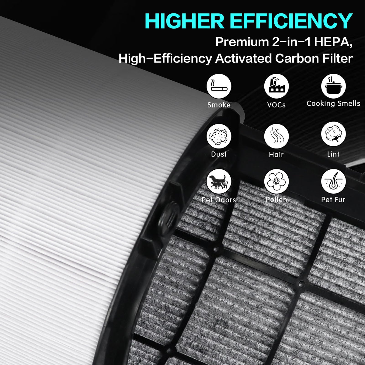 Q: What is the filtration efficiency of this HEPA filter?A: The high-quality TP10 True H13 HEPA filter can capture 99.97% of particles as small as 0.3 microns, including dust, pollen, and smoke, providing cleaner air for your home.