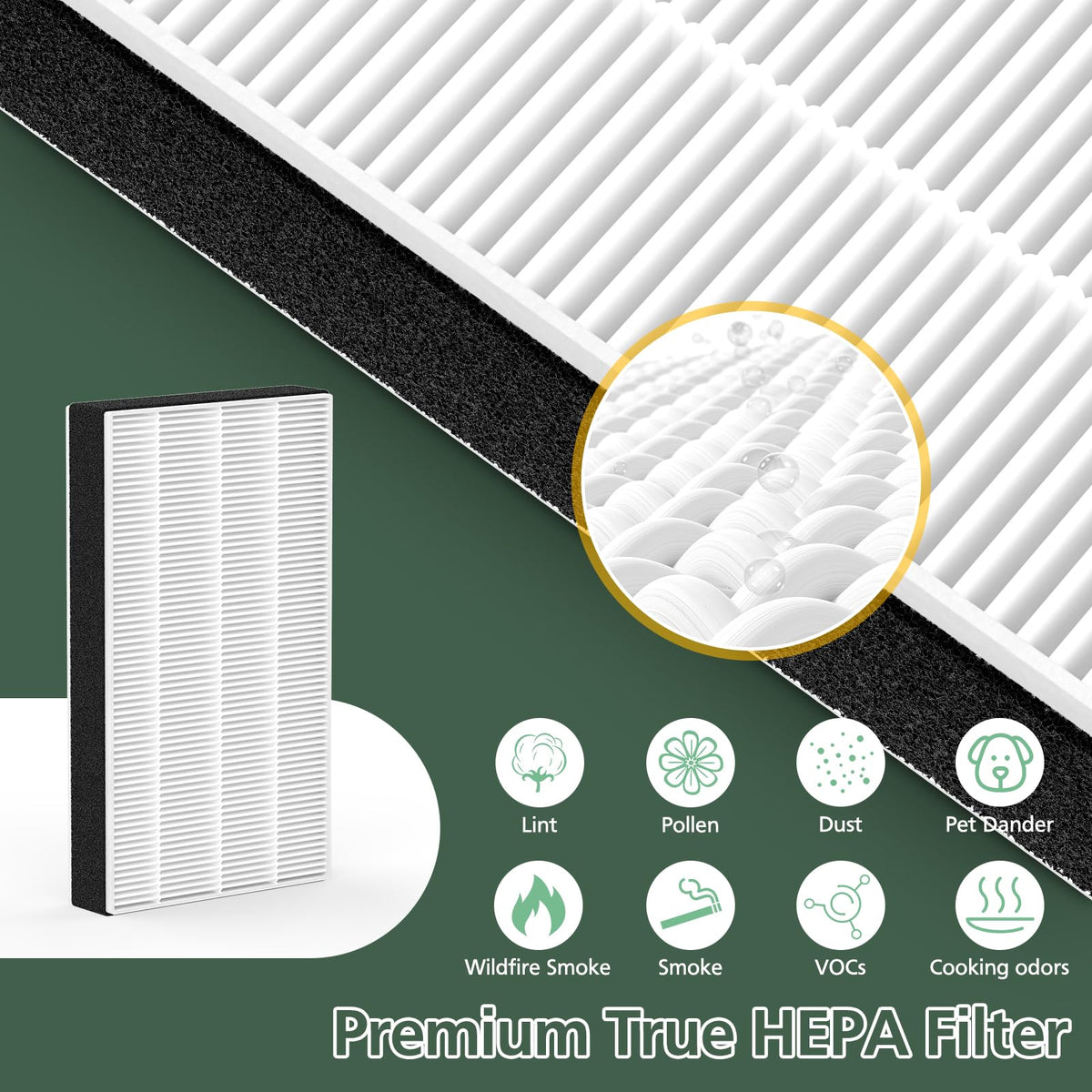 Q: What type of particles does the H13 True HEPA filter capture?A: The H13 True HEPA filter is designed to capture small particles, including dust, pollen, pet dander, and other allergens, providing a healthier living environment.