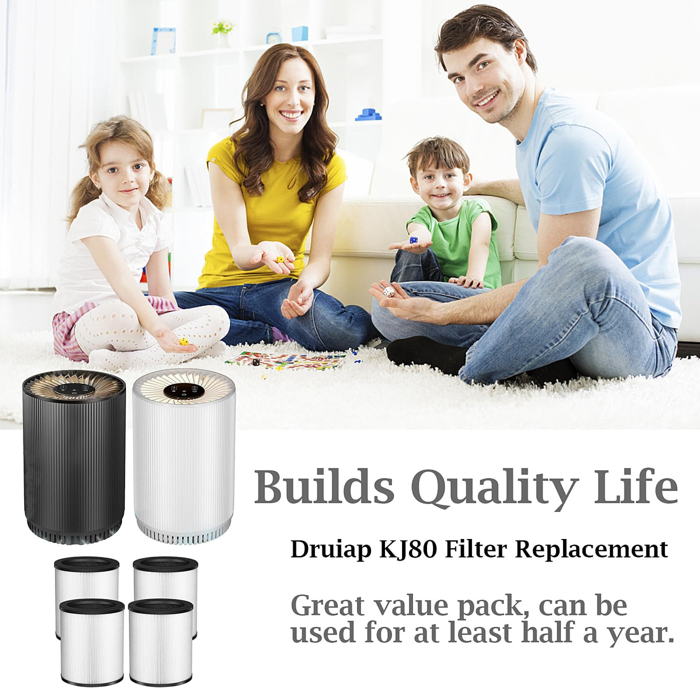 4 Pack Replacement Filter Compatible With Druiap Kj80 Air Puri-Fier, Upgraded 3-In-1 H13 Ture Hepa High-Efficiency Filterexclusively Designed For Druiap Kj80 Air Puri-Fier To Maintain Its Peak Performance.?High Quality H13 Ture Hepa Filter?* 3-In-1 Filtration System: The Replacement Filter For Druiap Kj80 Is A 3-In-1 True Hepa Filtration System Including Ultra-Fine Pre-Filter, True Hepa Filter, And Activated Carbon Filter. * The Replacement Filter For Druiap Kj80 Can Effectively Attach 99.97% Of All Airborne Particles Down To 0.3 Microns In The Air Like Dust, Hairs, Pet Fur, And Lint, And Prolongs The Life Of The Hepa Filter For Druiap Kj80 Air Puri-Fier To Keep Clean From Dust, Pollen, Smoke Particles, Pet Dander. Creating Fresh And Purified Air For You And Your Family.* Clean Every Corner For You To Provide The Cleanest And Most Comfortable Environment.?Guide?The Filter Can Last At Least 6-8 Months If This Air Puri-Fier Runs At The Highest Speed. Meanwhile, The Filter'S Usage Time Will Depend On The Environmental Air Quality Around You.?How To Replace The Filter Element?The First Step Is To Open The Back Cover Of The Air Puri-Fier. The Second Step Is To Remove The Old Filter Element And Replace It With A New One. (The Charcoal Side Of The New Filter Is Inside). The Third Step Is To Close The Lid.?Note?* Please Remove The Plastic Packaging Of The New Filters Before Placing Them Into The Air Puri-Fier.* It Should Be Stored In A Dry Location Protected Against Moisture.