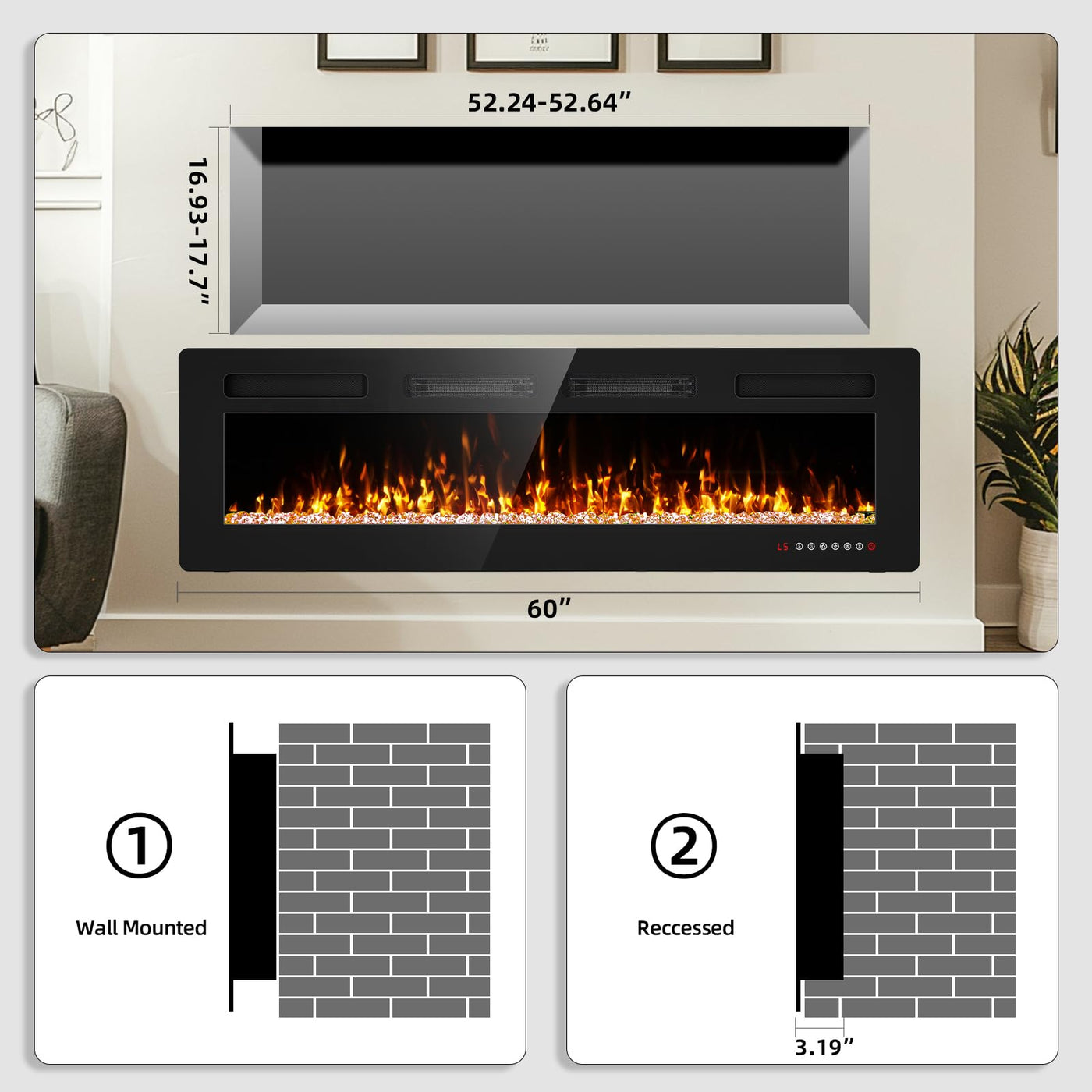 Q: Can the electric fireplace be mounted on the wall?A: Yes, the 60 inch Ultra Thin Electric Fireplace can be either recessed into the wall or wall-mounted, providing a sleek and modern look that enhances any room's decor.
