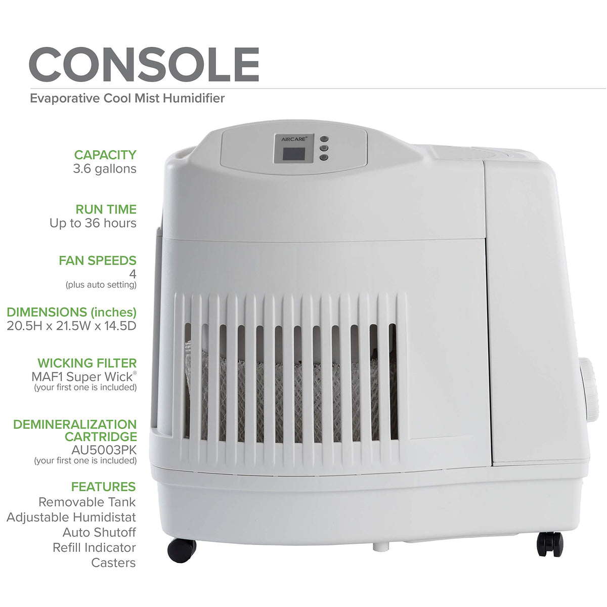 The Powerful Console Evaporative Humidifier Can Humidify A Home Up To 3,600 Square Feet. Its Tank Is Easy To Refill In A Sink, And Digital Controls Make Settings Simple. The Console Has An Auto Setting That Allows The Fan To Self-Adjust According To The Selected Humidity Level. The Console Uses Our Maf1 Super Wick (Your First One Is Included).