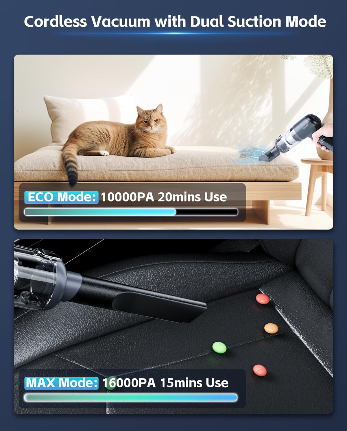 Q: What is the suction power of the AX2V Portable Car Vacuum?A: The AX2V Portable Car Vacuum features an impressive suction power of up to 16,000Pa, making it highly effective for removing dirt, dust, and debris from your car and other surfaces.