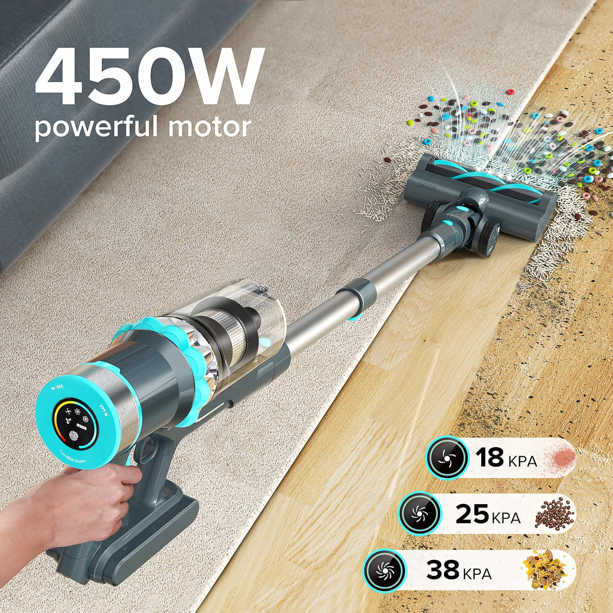 Q: What is the suction power of the Belife BVC11 Cordless Vacuum Cleaner?A: The Belife BVC11 features a powerful 38KPa suction capability, generated by its 450W brushless digital motor, making it effective for deep cleaning carpets and hard floors.