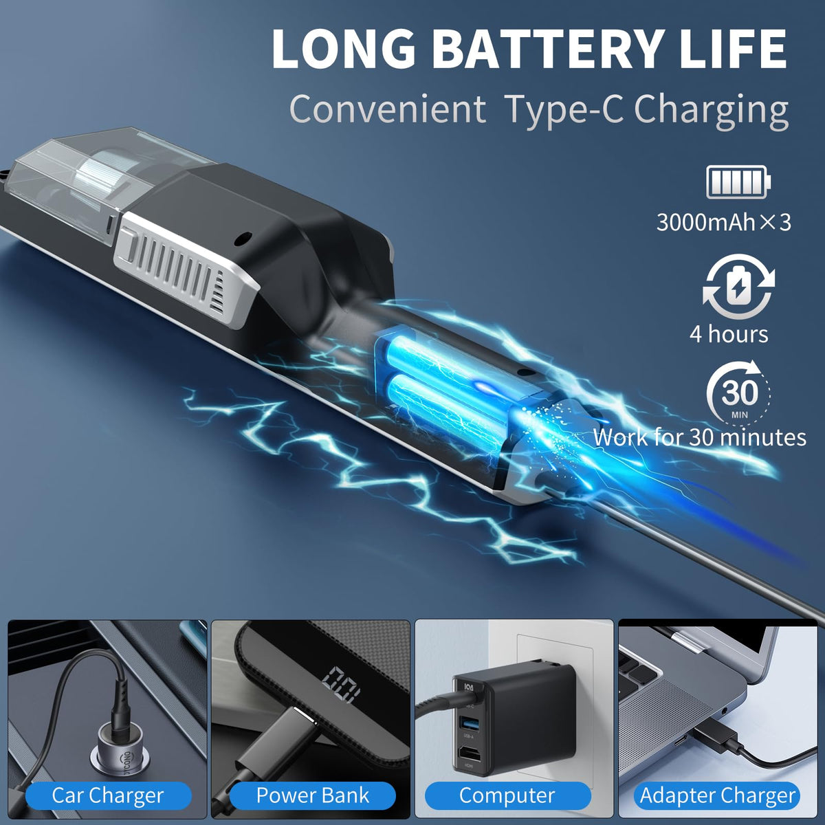 Q: How long does the battery last on a full charge?A: The vacuum features a large-capacity 9000mAh battery, providing a runtime of 30 minutes in Eco mode and 20 minutes in Max mode, making it ideal for thorough cleaning sessions.