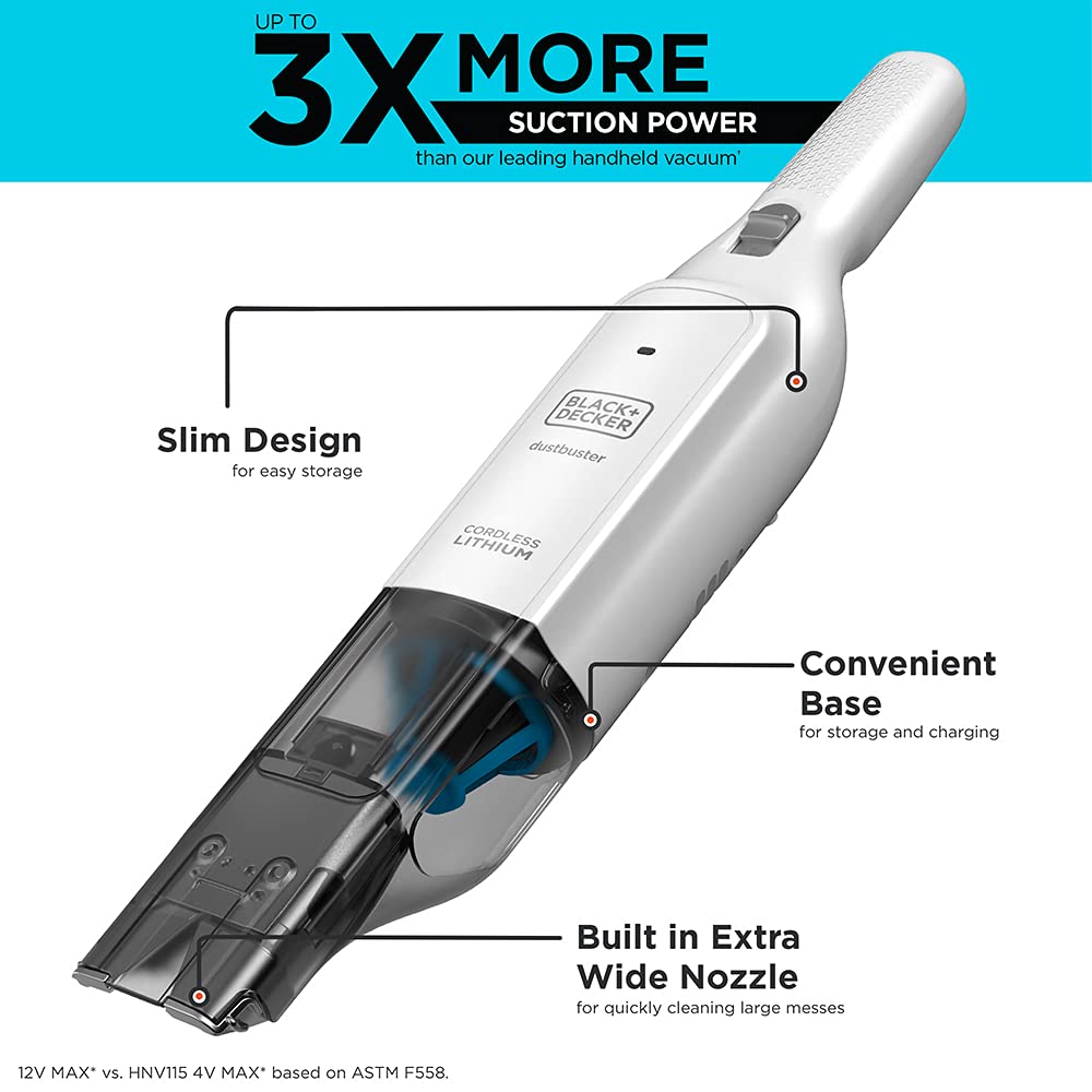 Spills Are Unpredictable, But You Can Make Sure You'Re Ready For Them With This Dustbuster� 12V Max* Advancedclean� Slim Cordless Hand Vacuum. Its High-Performance Motor Was Built To Provide 3X More Suction Power**. While Messes Are Not Usually Enjoyable, They Can Be Made Easy To Clean Up With This Vacuum'S Extra-Wide Nozzle That Was Designed To Accelerate The Tidy-Up Process. This Cordless Hand Vacuum�S Dustbin Removes Quickly For Swift, But Efficient Emptying. Conveniently Recharge With The Included Base Charger So That When The Next Mess Happens, You�Re Ready.