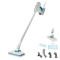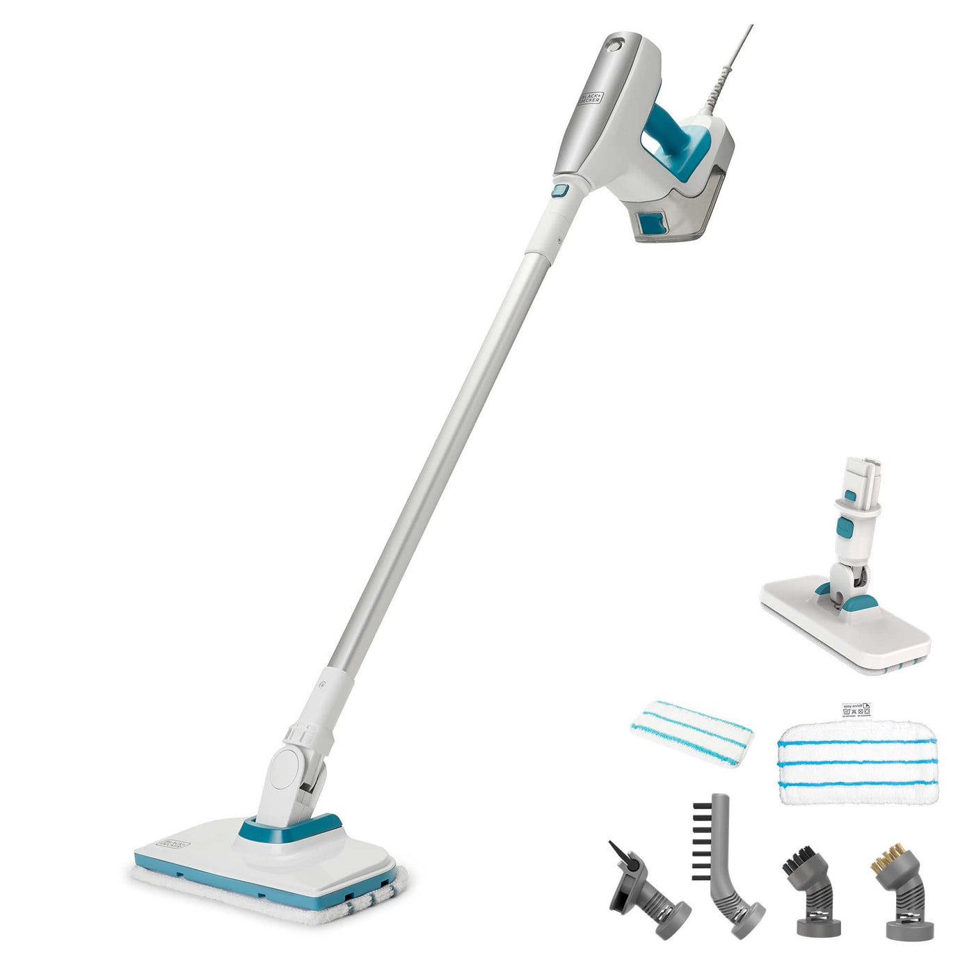 Q: What attachments come with the BLACK+DECKER Steam Mop?A: The BLACK+DECKER Steam Mop includes 6 attachments designed for various cleaning needs, such as a garment steamer for refreshing clothing and upholstery, and a small pivoting mop head for hard-to-reach areas like countertops and bathroom walls.