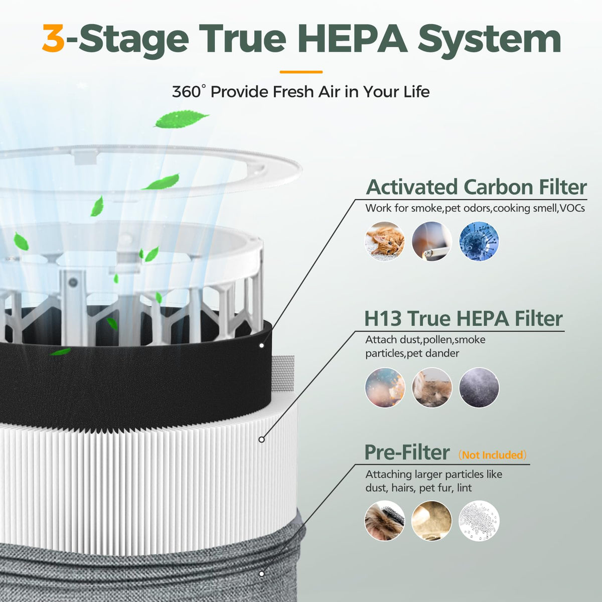 Q: What kind of filtration system does the Blue Pure 511 filter use?A: The Blue Pure 511 filter utilizes a double-layer high-efficiency filtration system. It features an H13 True HEPA filter that captures 99.97% of airborne particles down to 0.3 microns, along with an activated carbon filter that helps eliminate household odors.
