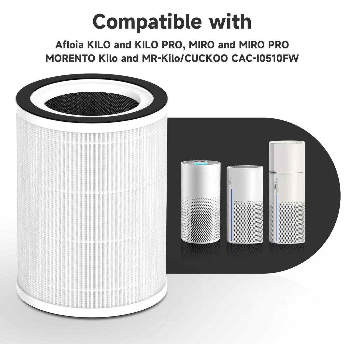 Q: What air purifiers are compatible with the Breabetter KILO True HEPA Replacement Filter?A: The Breabetter KILO True HEPA Replacement Filter is compatible with Afloia Air Purifiers including KILO, KILOPLUS, KILOPRO, MIRO, and MIRO PRO, as well as MORENTO Air Purifier Kilo/MR-Kilo. It is also suitable for CUCKOO CAC-I0510FW.