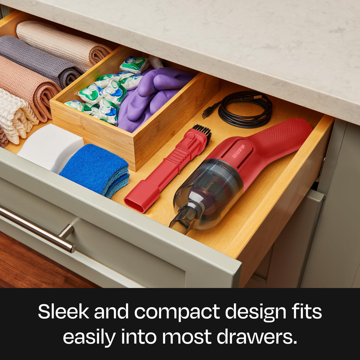 Clean With Ease And Versatility Using The Buff Hand Held Vacuum Cordless Rechargeable Cleaner. This Mini Vacuum Cleaner Is Compact And Portable, With A Cordless Design That Makes Vacuuming Your Car, Home, Or Office Easier Than Ever Before. The Design Is Sleek And Light, Ensuring That Its Comfortable To Use For Any Cleaning Task, And Seamless To Store In Any Drawer, Closet, Or Cabinet. The Small Vacuum Charges Quickly And Runs Long Enough To Make All-Purpose Cleaning A One-Stop Task. Use The 2-In-1 Crevice And Brush Tool To Clean In Tight Spaces Or Any Dirty Surfaces, And The Washable Filter Means You Wont Have To Purchase A Replacement.