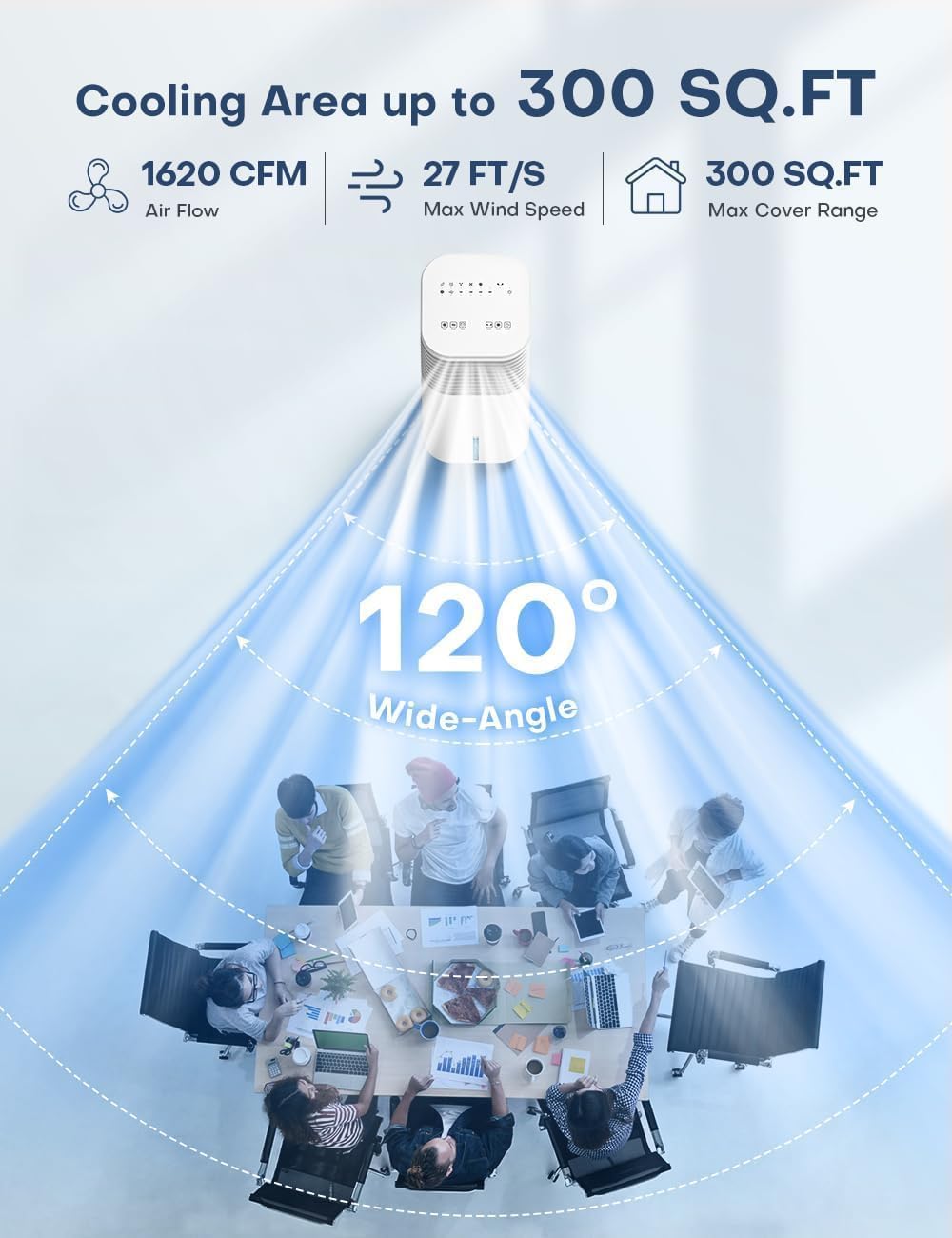 Q: Can the CENSTECH air conditioner effectively cool large spaces?A: Yes, the CENSTECH air conditioner can efficiently cool spaces up to 300 square feet. It features a strong airflow of 1620 cubic feet per minute and a 120° oscillation function, ensuring even distribution of cool air throughout the room.