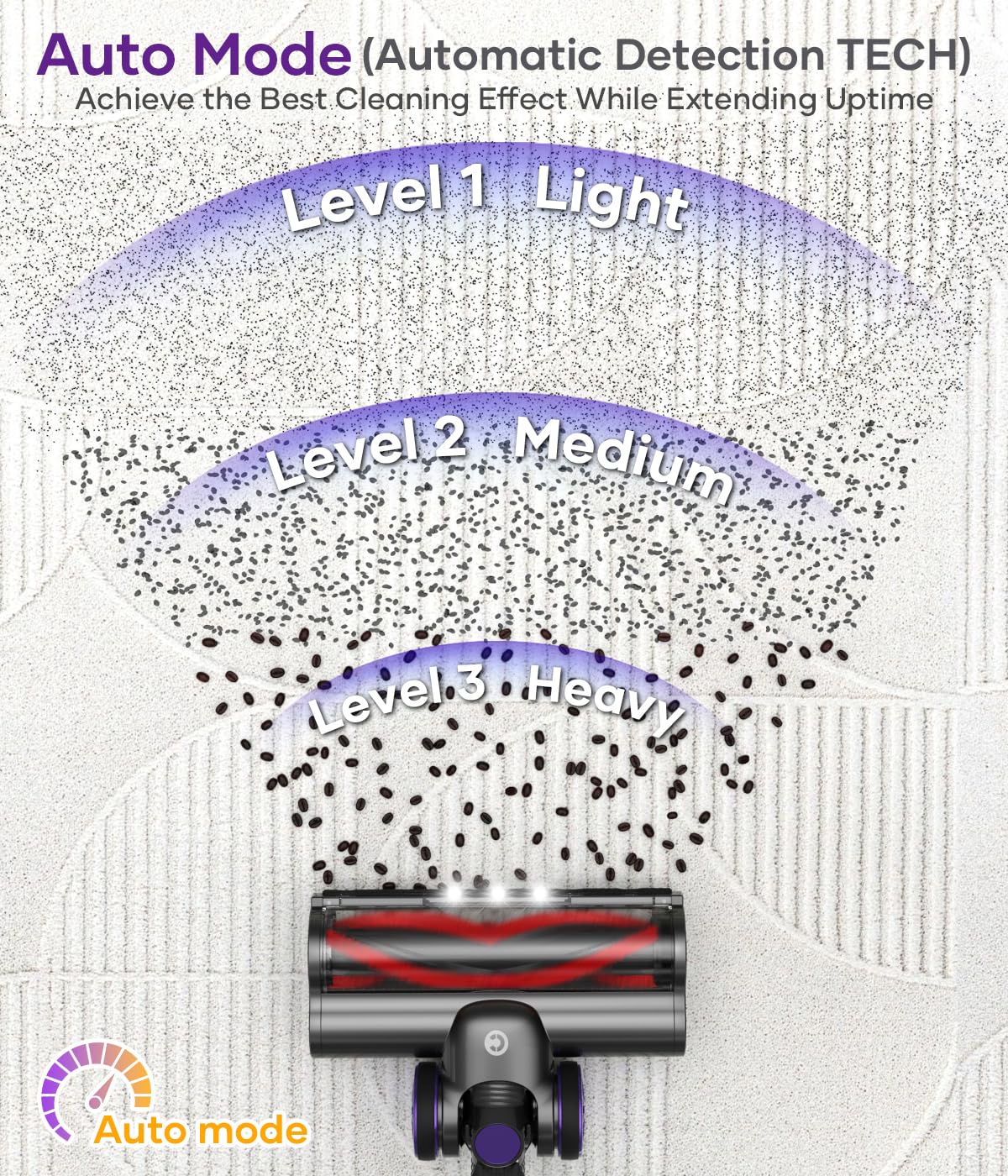 Q: How does the suction power auto adjustment feature work?A: The CHEBIO vacuum contains a dust intelligent detection sensor system that automatically adjusts the suction power based on the amount of detected debris and dust, ensuring optimal cleaning results while maximizing battery life.