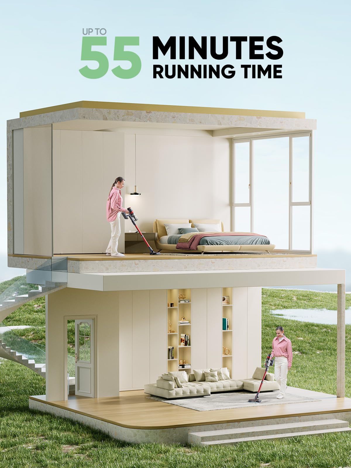 Q: What is the runtime of the Cordless Vacuum Cleaner?A: The Cordless Vacuum Cleaner offers an impressive runtime of up to 55 minutes on a single charge, thanks to its 7*2500mAh lithium-ion batteries.