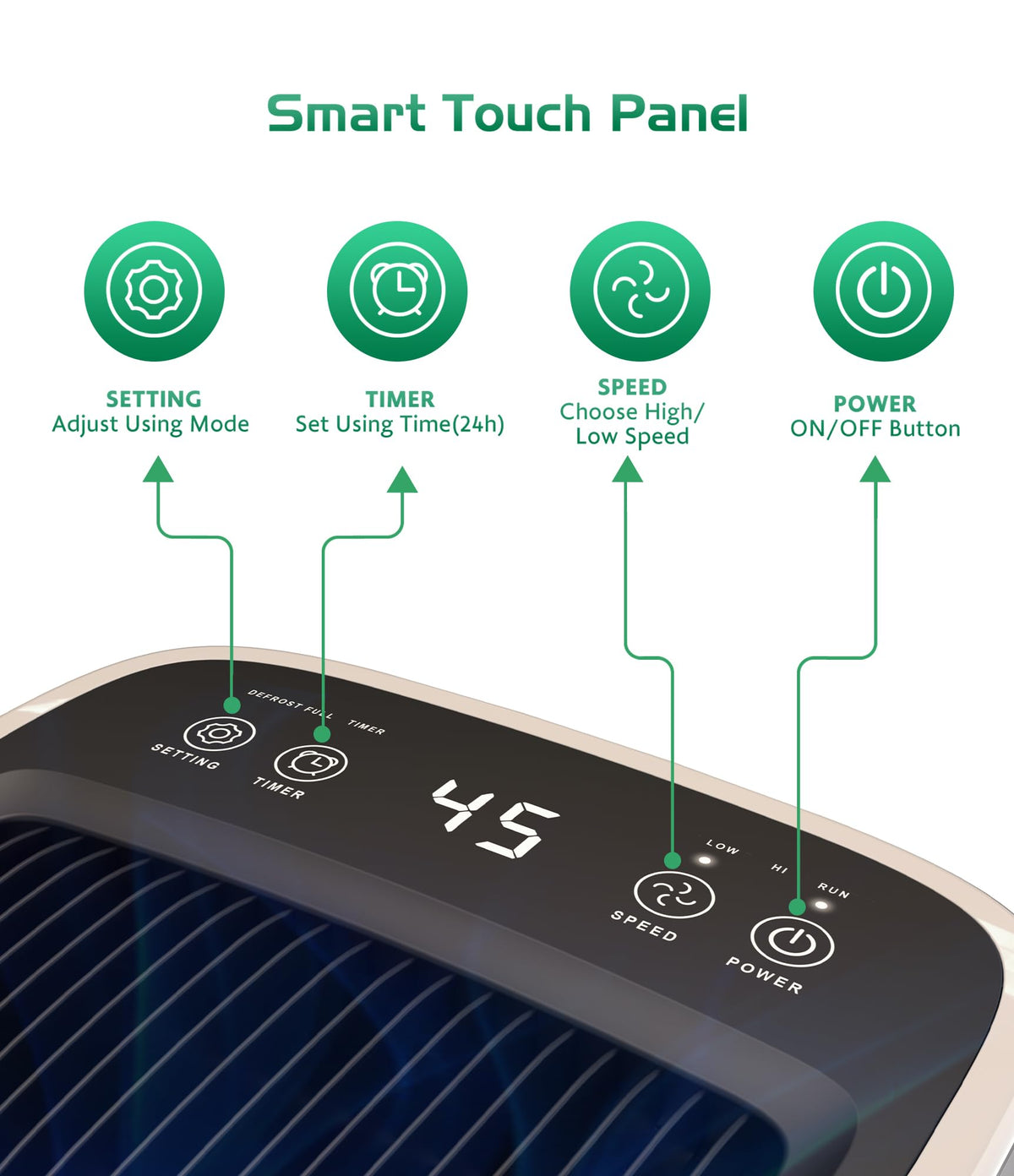 Q: What features make the RUWORA dehumidifier user-friendly?A: The RUWORA dehumidifier is equipped with a touch-sensitive smart screen for easy operation, a 24-hour timer for automated use, and a quiet operation mode that keeps noise levels below 40 decibels. Additionally, the portable design with 360° rotatable casters makes it easy to move between rooms.