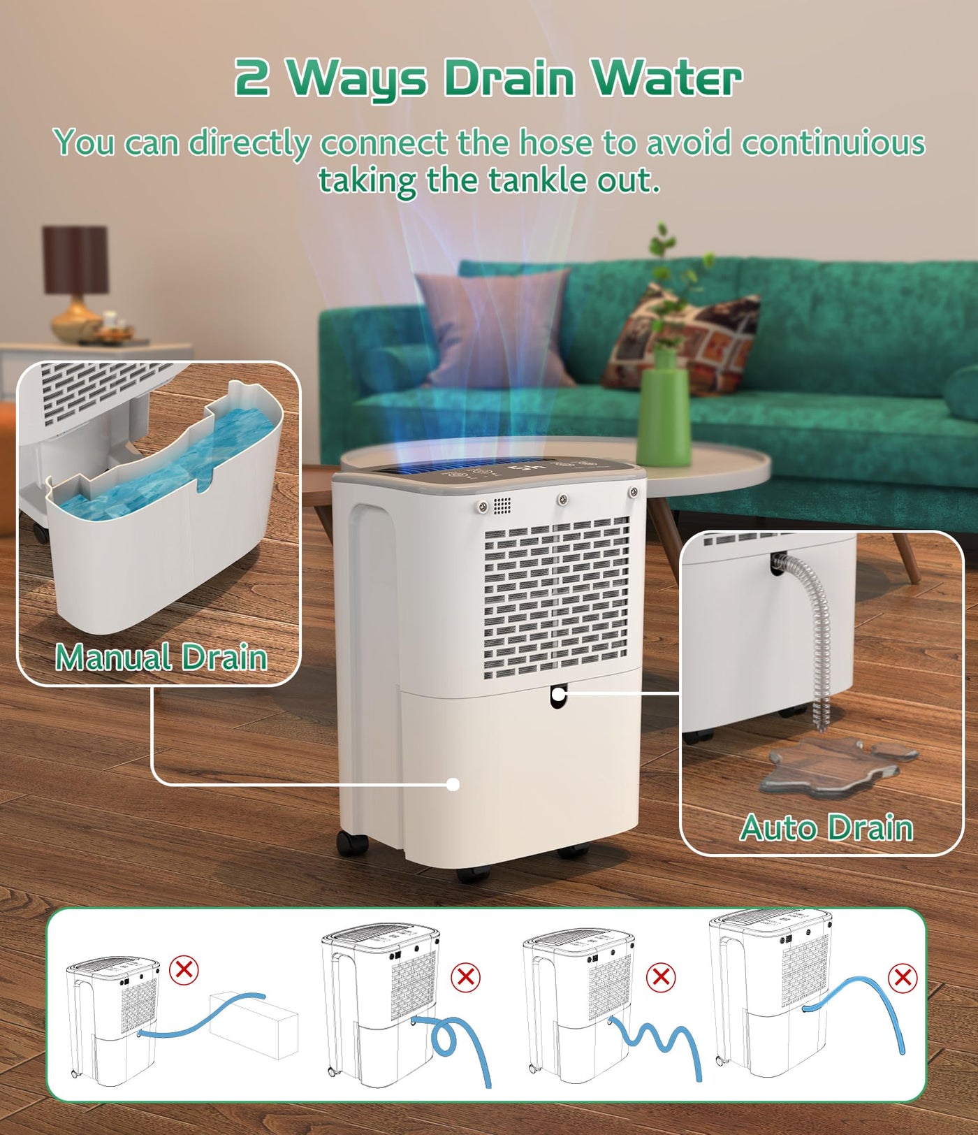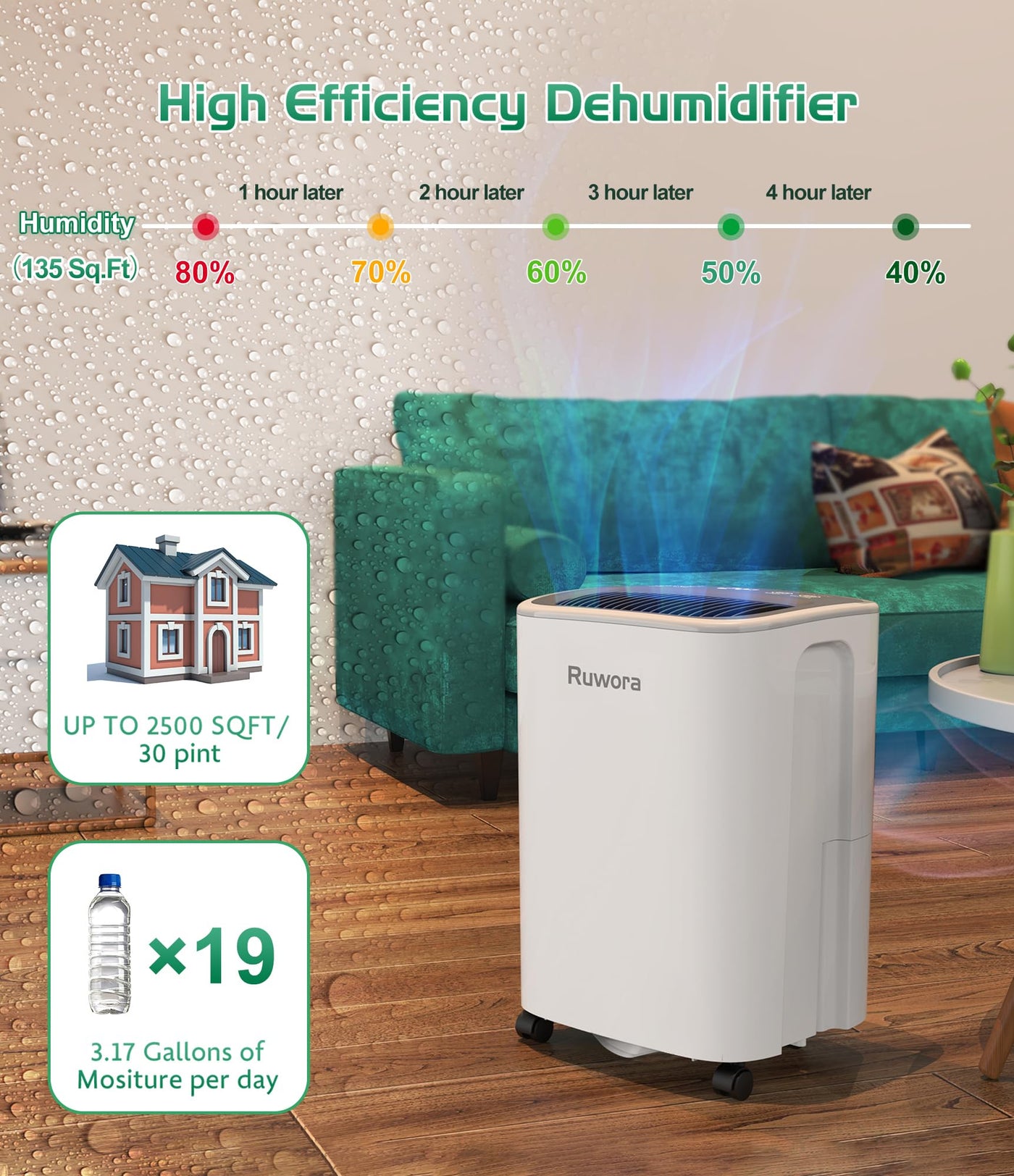 Why Do You Need The Dehumidifier In The Home?When The Humidity Level In Your Home Is Excessively High Or Low, It Can Create Unpleasant Living Conditions And Potentially Cause Long-Lasting Damage To The Property? So What Can Ruwora High-Efficient Dehumidifier Do For You?&Nbsp;1. Eliminates Unpleasant Odors And Excess Humidity Levels, Creating A More Comfortable Living Space2. Keeps Clothes, Floors, And Furniture Dry By Absorbing Excess Moisture? Ruwora High-Efficient Dehumidifier Can Create A Healthy And Soothing Environment For You And Your Family.?Product Specification:Power Source: 120 V~60 Hzrated Power(104 ?, 35% Rh):&Nbsp; 150 Wtotal Input Rated Current (104 ?, 35% Rh): 1.38Arated Capacity (65 ?, 60% Rh):8 Pints/Dayrated Capacity (86 ?, 80% Rh):25 Pints/Dayrated Capacity (95F, 90%Rh): 30 Pints/Day Ief(65 ?, 60% Rh):1.57L/Kwhtank Capacity: 2.5L/0.66 Galdrain Hose: 3.28Ft/39.37-Inch Length? Key Features:&Nbsp;1. Using Modes: Au Mode(Comfort Mode ), Co Mode (Continuous Mode)&Nbsp;2. Drain Options: Manual &Amp; Auto Drainage&Nbsp;3. Auto Defrost: When The Temperature Is Below 32?, The Dehumidifier Will Defrost Automatically4. Overflow Protection: When The Water Tank Is Full, This Home Dehumidifier Will Shut- Off? Package Including:Drain Hose: 1 Pcair Filtes: 2 Pcsruwora&Nbsp; Dehumidifier: 1 Pcuser Manual: 1 Pc&Nbsp;?Using Tips: This Home Dehumidifier Is Designed To Operate In A Working Environment Between 41 ?(5C) And 95 ?(32C). Before Use, Please Close The Doors And Windows To Ensure The Airtightness Of The Indoor Environment, So That The Use Effect Will Be The Best.&Nbsp;?Note!!!: Please Leave It Standing Upright And Outside The Box For 24 Hours Before Plugging It In.