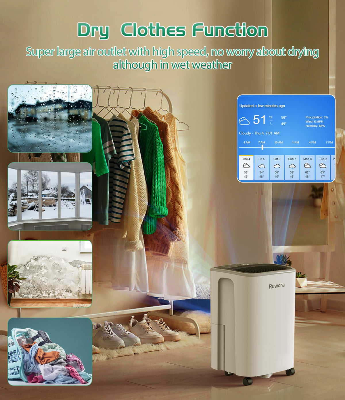 Q: How does the RUWORA dehumidifier improve indoor air quality?A: The RUWORA dehumidifier effectively removes excess moisture from the air, which helps eliminate unpleasant odors and prevents mold growth. By maintaining optimal humidity levels between 45%-55%, it creates a healthier living environment, particularly in spaces like basements, bedrooms, and bathrooms.