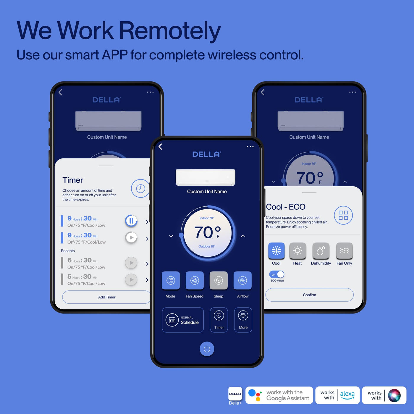 Introducing The Cutting-Edge Mini Split Air Conditioner Unit. The Unit Offers Versatile Modes, Including Cooling, Heating, Dry, Auto, And Fan, With 4 Speeds, 4D Airflow, Eco Energy Saving Mode, Sleep Mode, And Timer Function, It Supports Alexa And Wifi, And It Comes With A Specially Designed Remote Control. It Is Professionally Certified With Energy Star, Etl Listed, Ahri Certified, And Backed By A 5-Year Warranty, And Also Offers The Convenience Of Geo Fence Technology Through The Della+ App, Ensuring A Warm Welcome Upon Arrival And Efficient Energy Use. Unlock Advanced Technology With The Della Mini Split Ac'S Fin Technology, Enhancing Durability, Preventing Rust Corrosion, Speeding Up Defrosting, And Boosting Heat Efficiency, Setting New Standards For Superior Comfort.